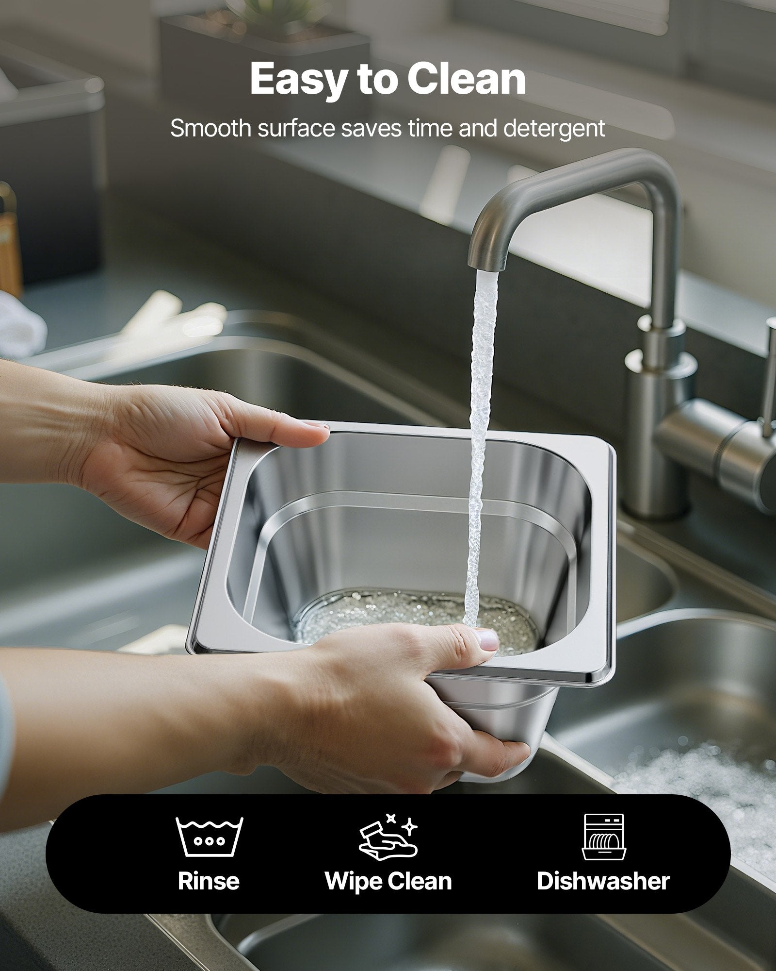 - Hochwertiger Edelstahl: Unsere Edelstahl-Gastronormschale ist aus robustem 22-Gauge-Edelstahl SS201 gefertigt und zeichnet sich durch Langlebigkeit und hervorragende Rostbeständigkeit aus. Sie eignet sich ideal zum Warmhalten von Speisen und Getränken und ist temperaturbeständig von -40 °F bis 500 °F (-4 °C bis 260 °C). Geeignet für gewerbliche Geschirrspüler, Kühlschränke, Gefrierschränke und mehr.