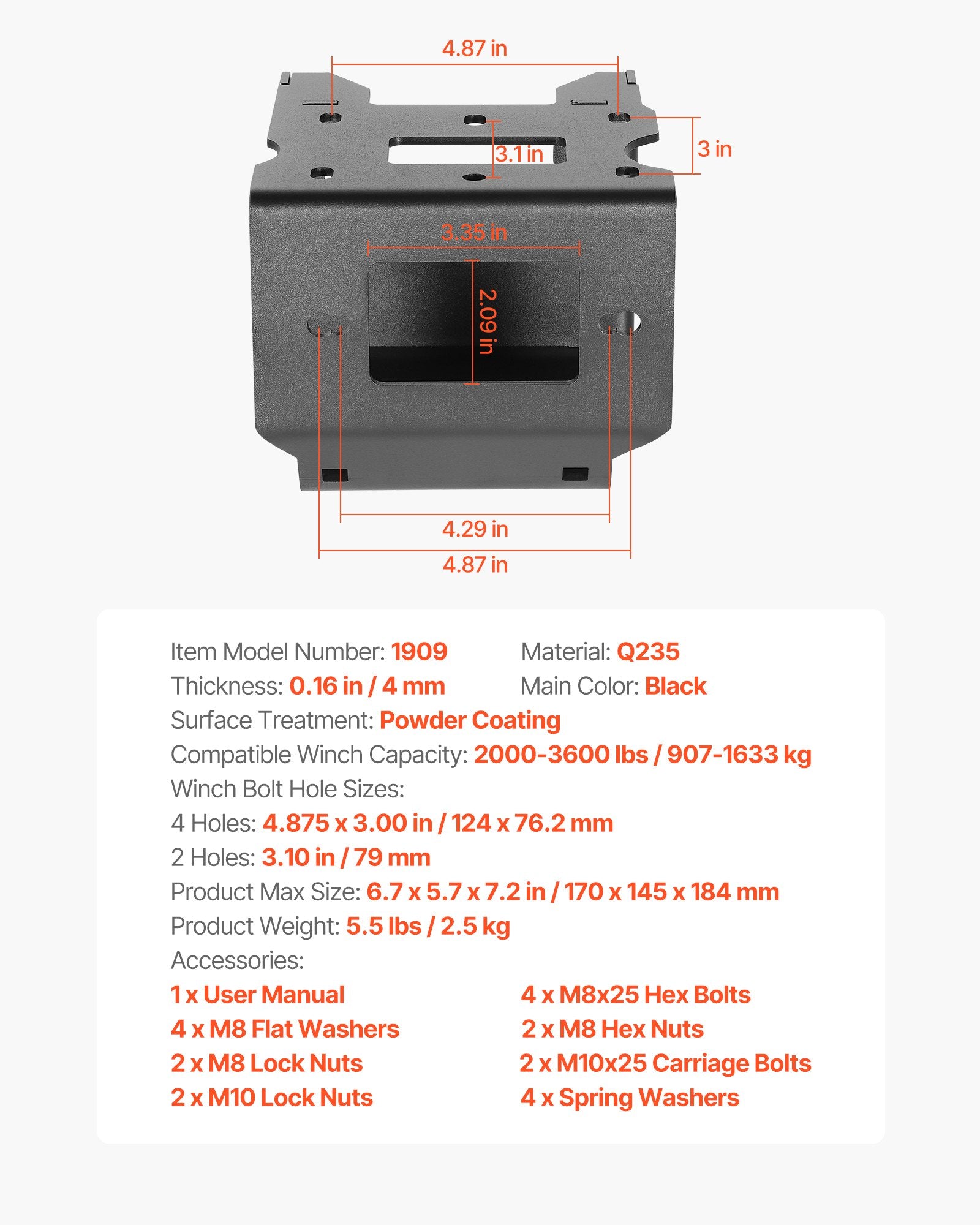 - 2 Befestigungslöcher für Seilwinden: Die Anhängerseilwindenhalterung unterstützt Standard-Befestigungen mit 4 Löchern (4,9 x 3,0 Zoll) und 2 Löchern (3,1 Zoll). Dank des vielseitigen Designs ist sie mit den meisten Standardseilwinden kompatibel und deckt somit ein breites Spektrum an Benutzerbedürfnissen ab.