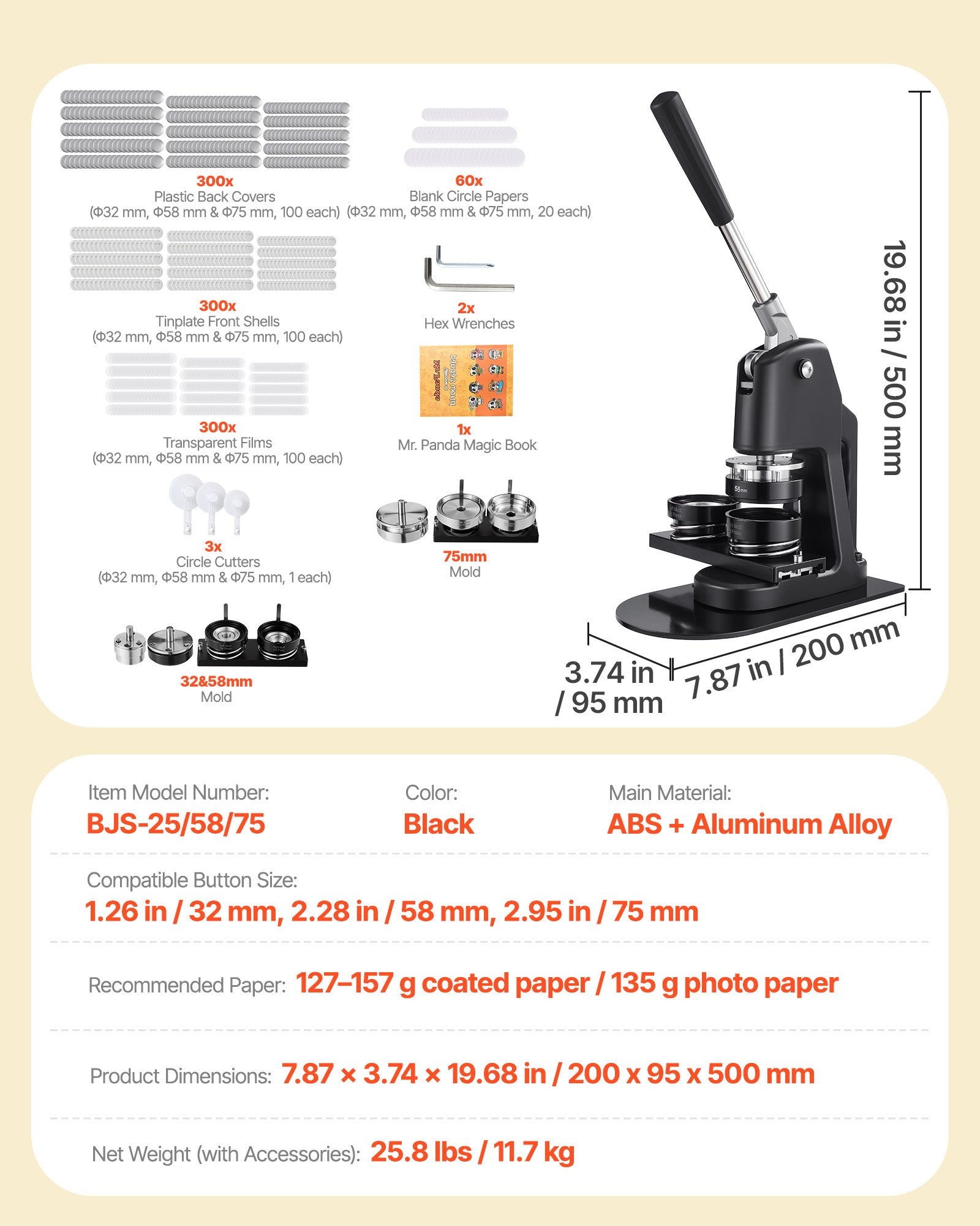 Buttonmaschine, 32/58/75 mm, 3-in-1, Anstecknadelmaschine mit 300 Buttonrohlingen, Kreisschneider und Zauberbuch, verstärkter ergonomischer Griff, für selbstgemachte Anstecknadeln und personalisierte Pins, Schwarz