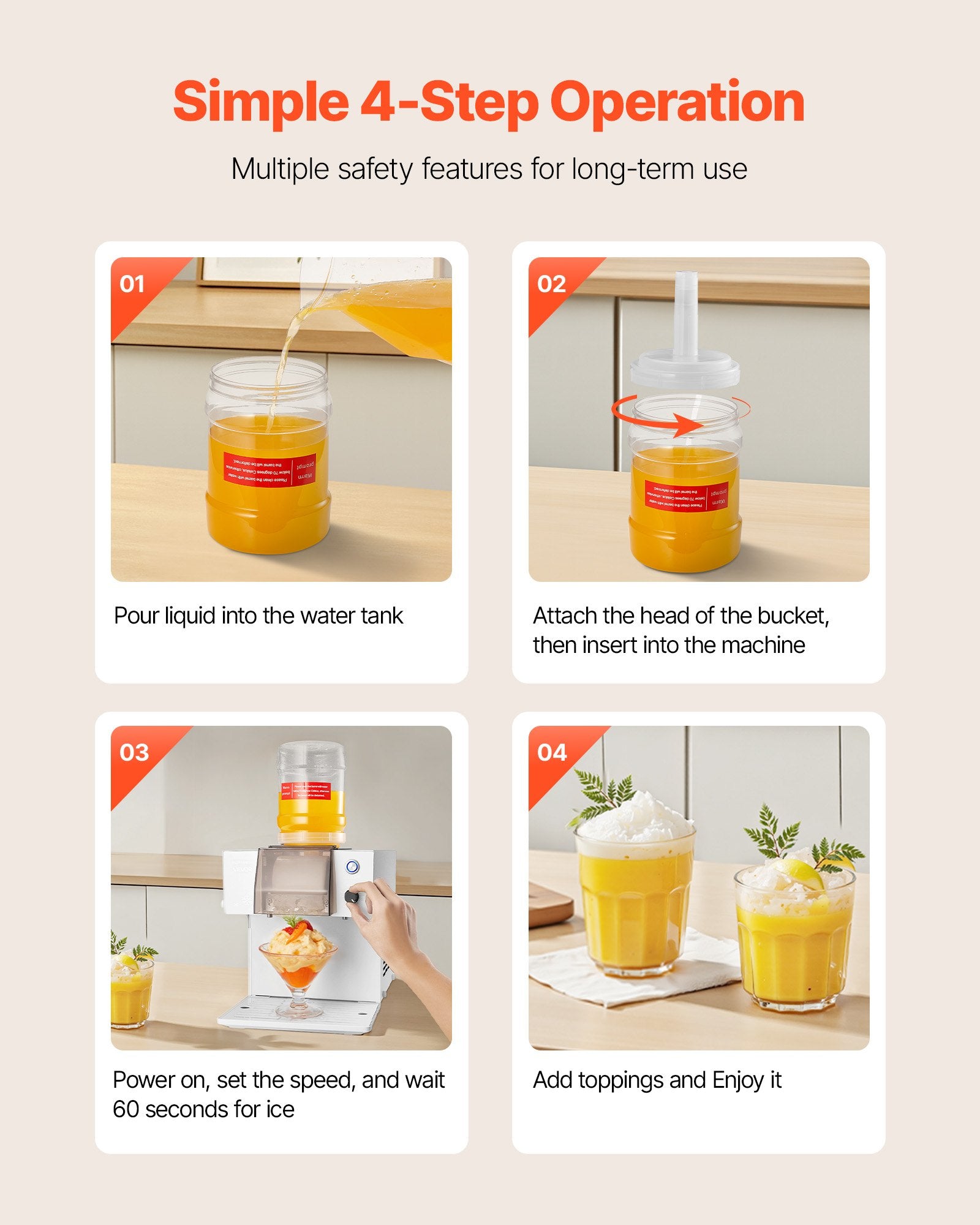 - 0-100 einstellbare Geschwindigkeiten: Mit 0-100 einstellbaren Geschwindigkeiten ermöglicht Ihnen diese Schneeflocken-Eismaschine die Zubereitung verschiedener Eistexturen wie fluffiges Schneeflockeneis, dünne Streifen, nudelartiges Eis oder Flocken – für stets cremige und erfrischende Desserts.