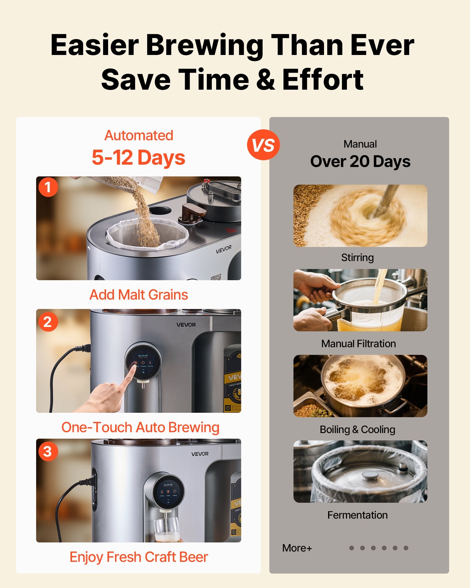 - Intelligentes Brühen per Knopfdruck: Einfach Zutaten hinzufügen und los geht's. Das LCD-Display führt Sie durch jeden Schritt – kein manuelles Umfüllen nötig. Brühzeit: 5–12 Tage. Diese automatische Heimbrühmaschine bietet 14 voreingestellte Rezepte sowie einen DIY-Modus für kreative Brauer.