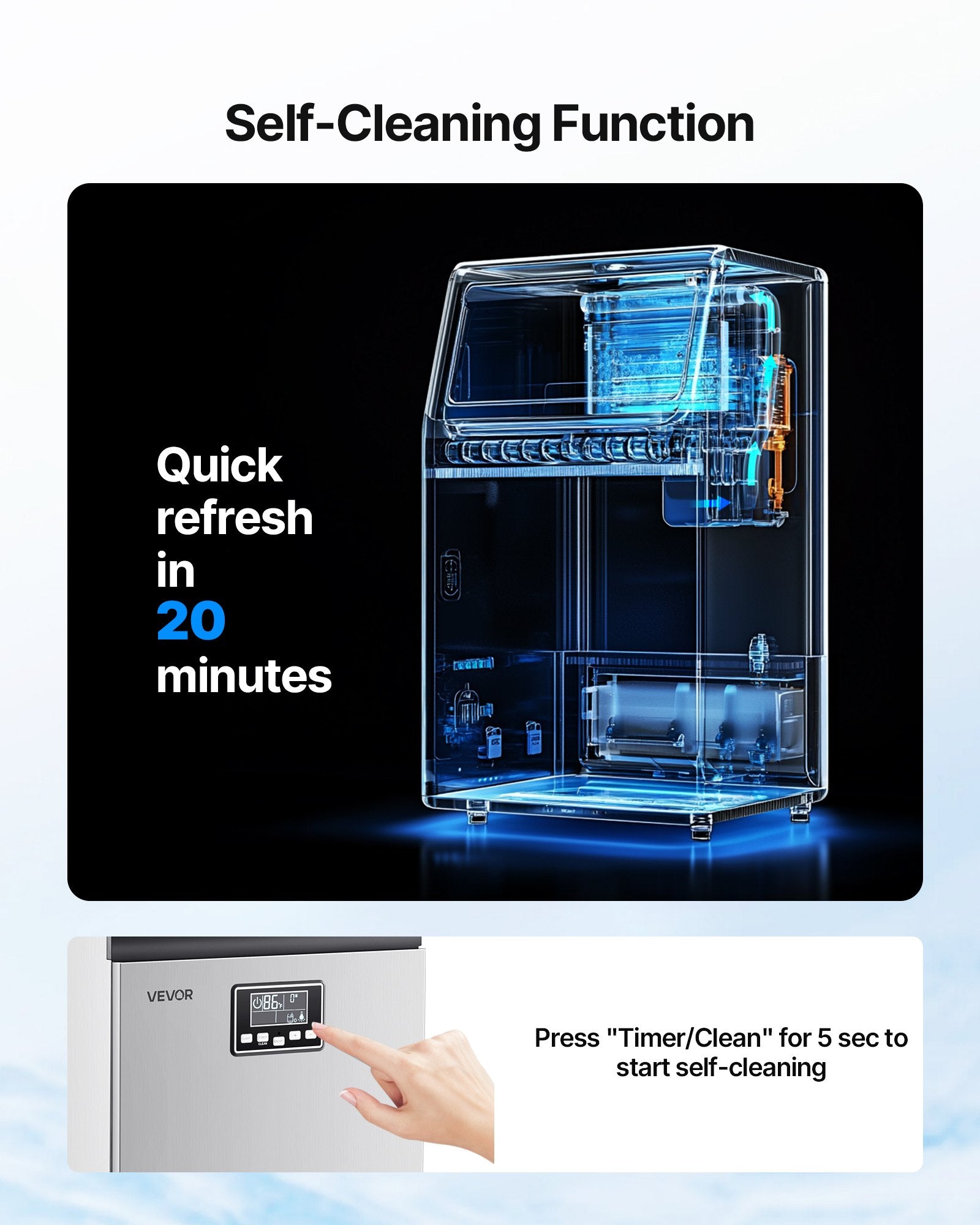 - Einfache Reinigung: Dieser selbstreinigende Eiswürfelbereiter führt nach 3 Sekunden Drücken der „Mode“-Taste einen 20-minütigen automatischen Spülzyklus durch.