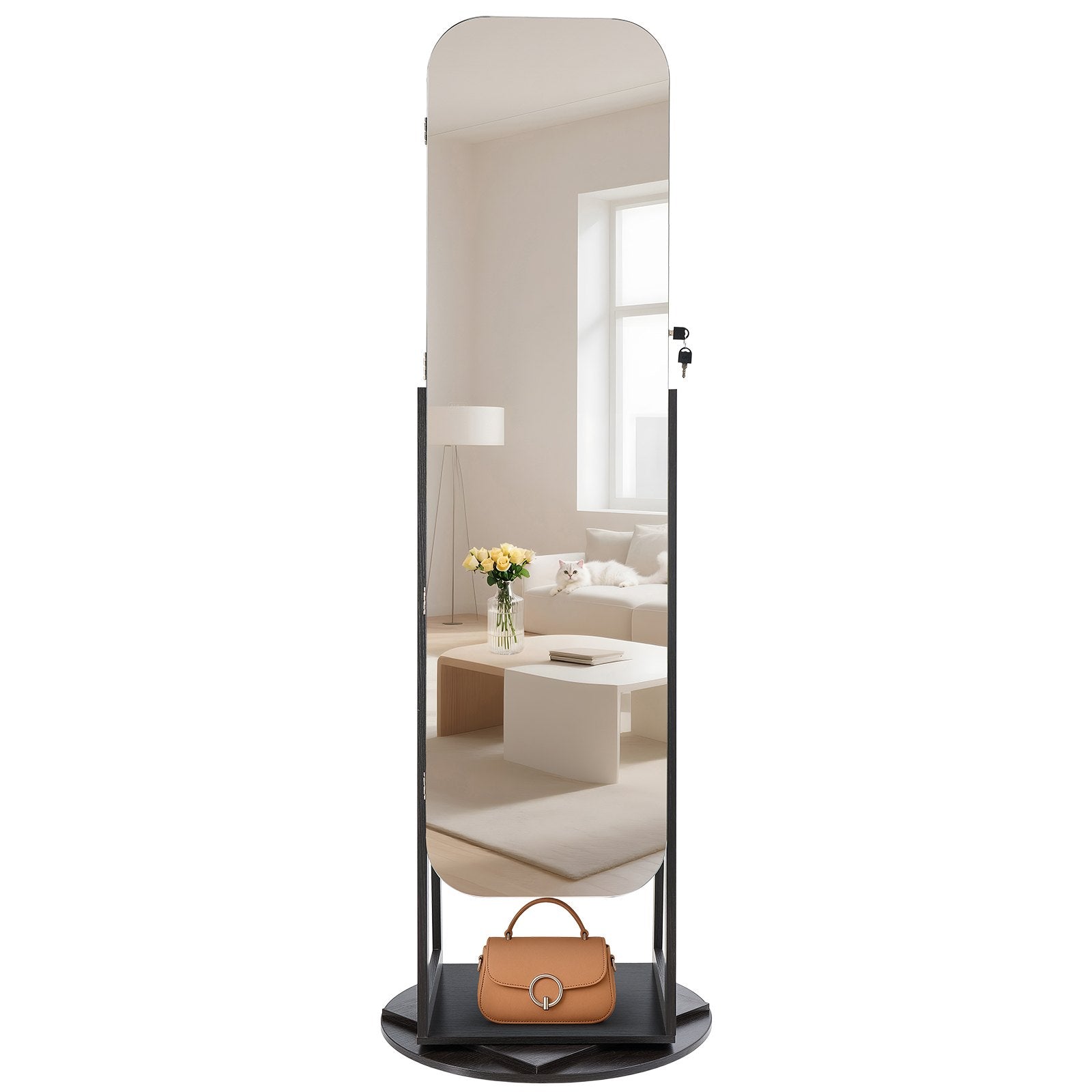 360° drehbarer Schmuckschrank, 1600 mm hoch, Ganzkörperspiegel mit Ablage, freistehender, drehbarer Schmuckschrank-Organizer, abschließbare Tür mit 2 Schlüsseln, Zubehörtaschen und Ablagefächern.