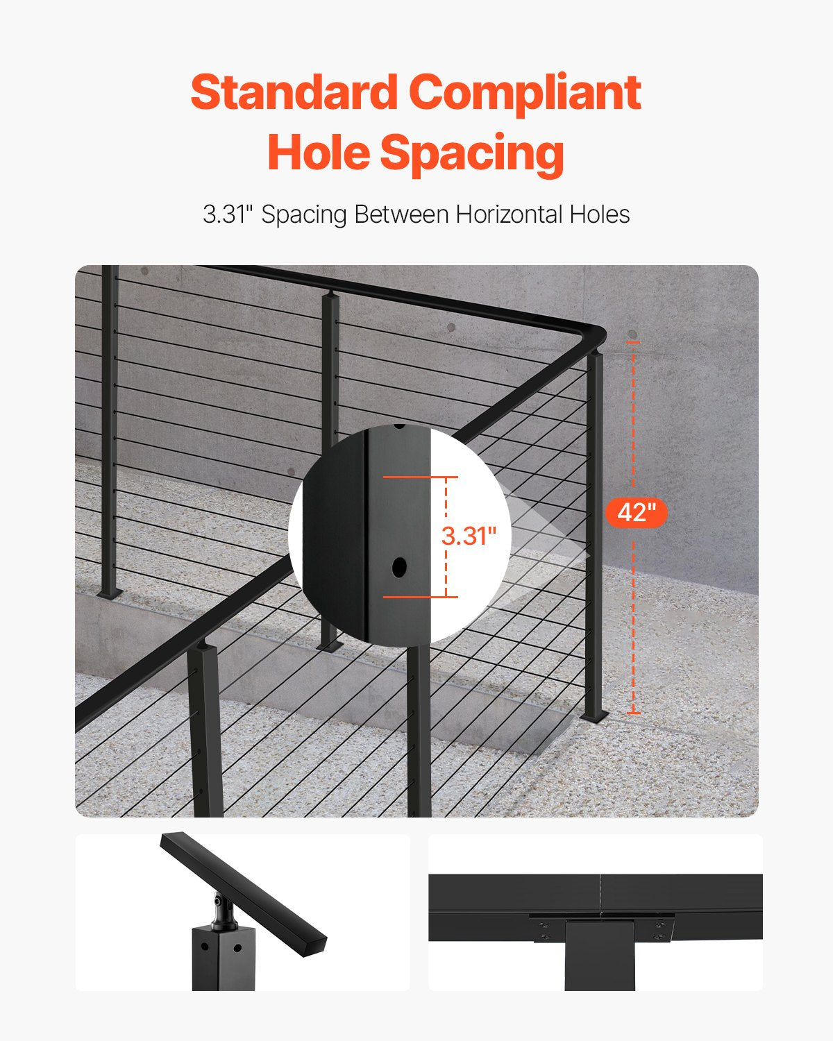 Cable Railing Post, 42x2x2 Inch Corner Railing Post, with L-Shaped Pre-Drilled Holes, Stainless Steel Cable Rail Post with Horizontal and Curved Bracket, 1-Pack, Black, 1JZLGZXHS1065S1EW001V0