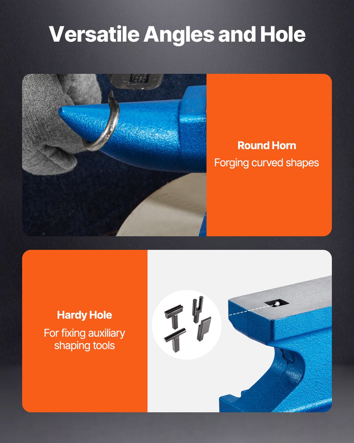 - Hole & Horn for Different Uses: The round horn of the blacksmith anvil can be used for flatting, bending, and shaping. And the hardy hole shows a good performance in accessories’ punching and twisting.