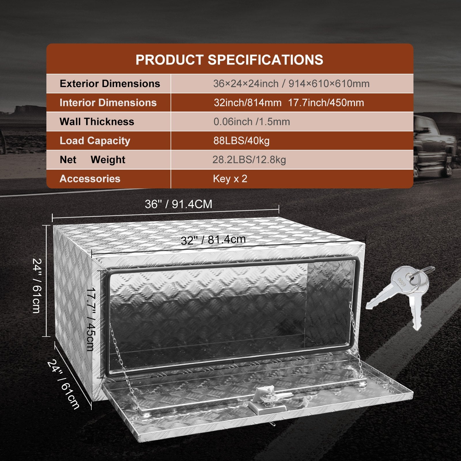Underbody Truck Box, 36"×24"×24" Pickup Storage Box, Heavy Duty Aluminum Diamond Plate Tool Box with Lock and Keys, Waterproof Trailer Storage Box with T-Handle Latch for Truck, Van, Trailer