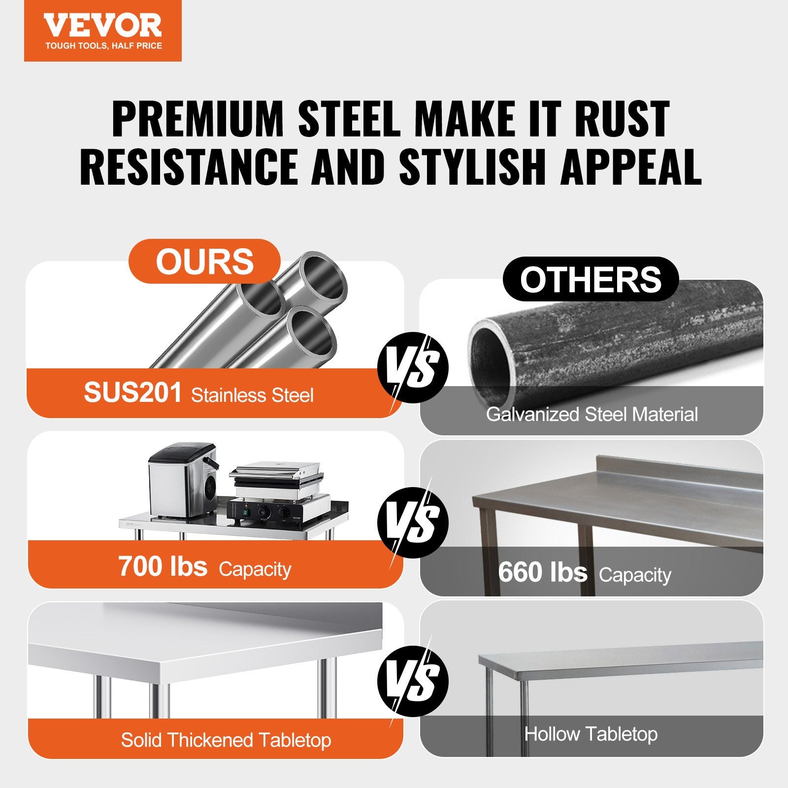 - High-Quality Stainless Steel: This work table, measuring 24 x 30 x 40 inch, is made from SUS201 stainless steel for the tabletop, shelves, and legs. It offers superior rust resistance, a sleek appearance, and a smooth surface that is easy to clean with a simple wipe. NSF certified, it meets strict public health standards, ensuring long-lasting protection for your health.