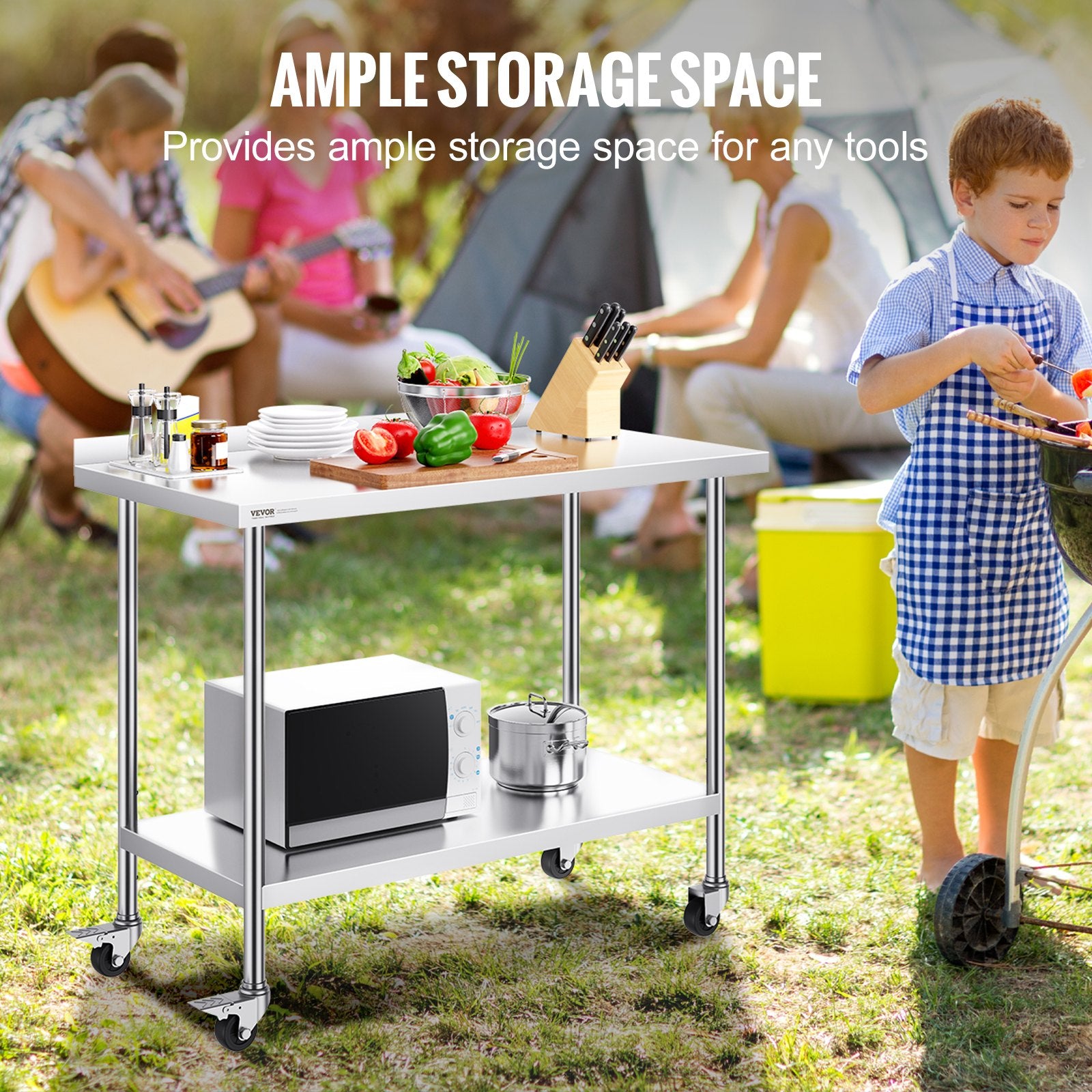 - User-Friendly Design: Featuring 3-level adjustable shelves, this work table offers the most user-friendly and practical functionality. Simply adjust the shelf height with screws to accommodate items of different sizes. Equipped with 4 swivel casters, including 2 with brakes, the table remains stable and can be easily moved to any location. The high rear backsplash prevents items from falling off and guards against water splashes.