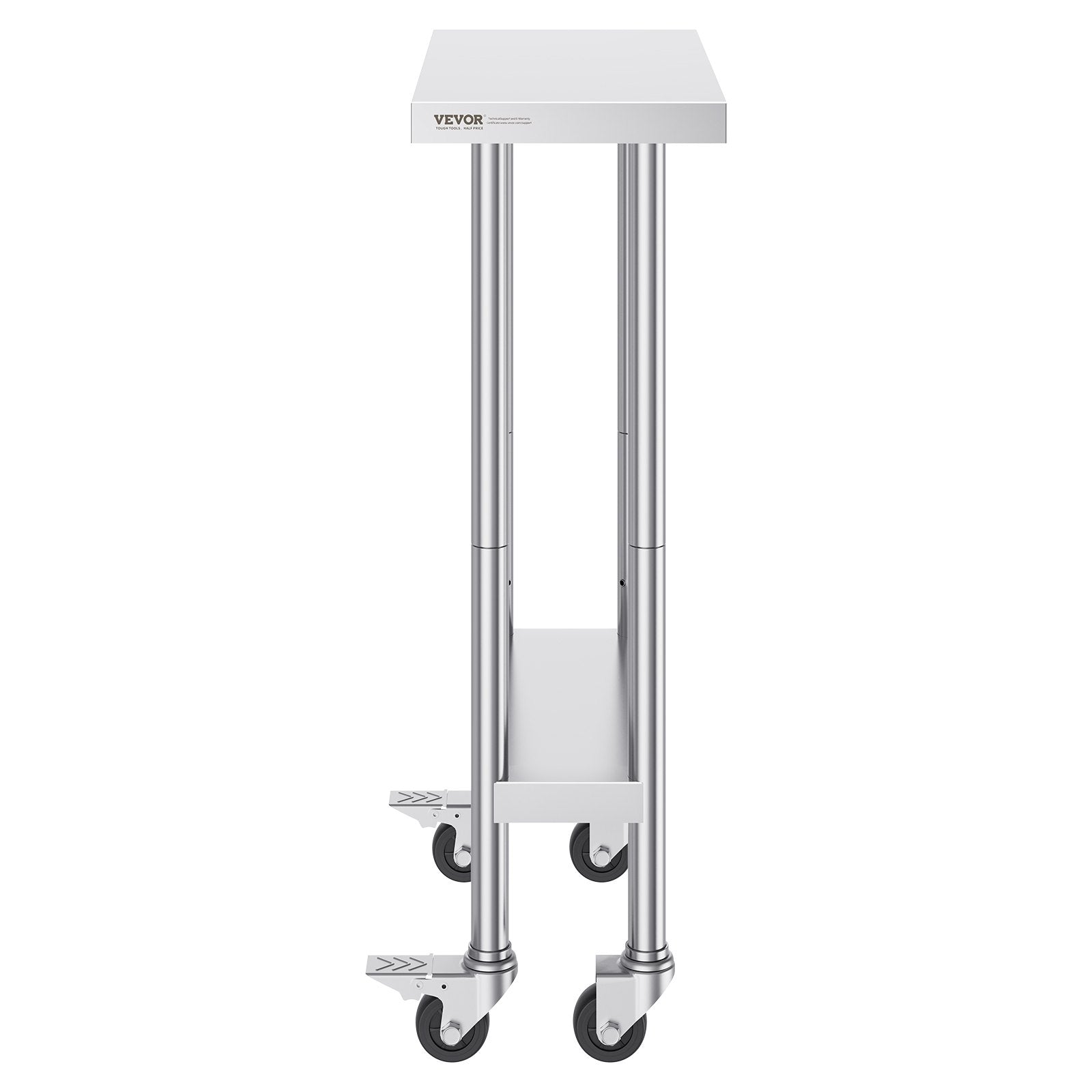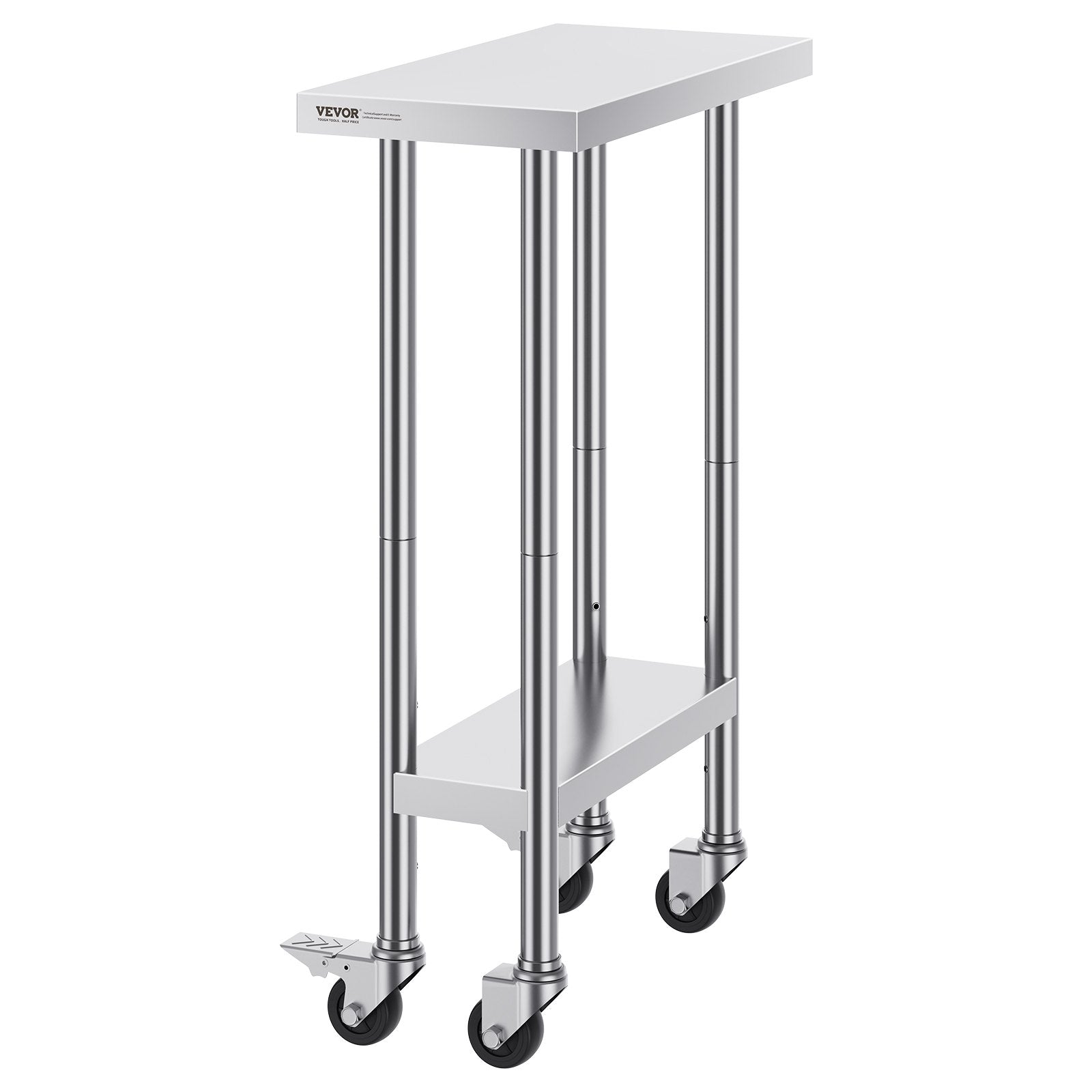 Stainless Steel Work Table 24 x 12 x 38 Inch, with 4 Wheels, 3 Adjustable Height Levels, Heavy Duty Food Prep Worktable for Commercial Kitchen Restaurant, Silver