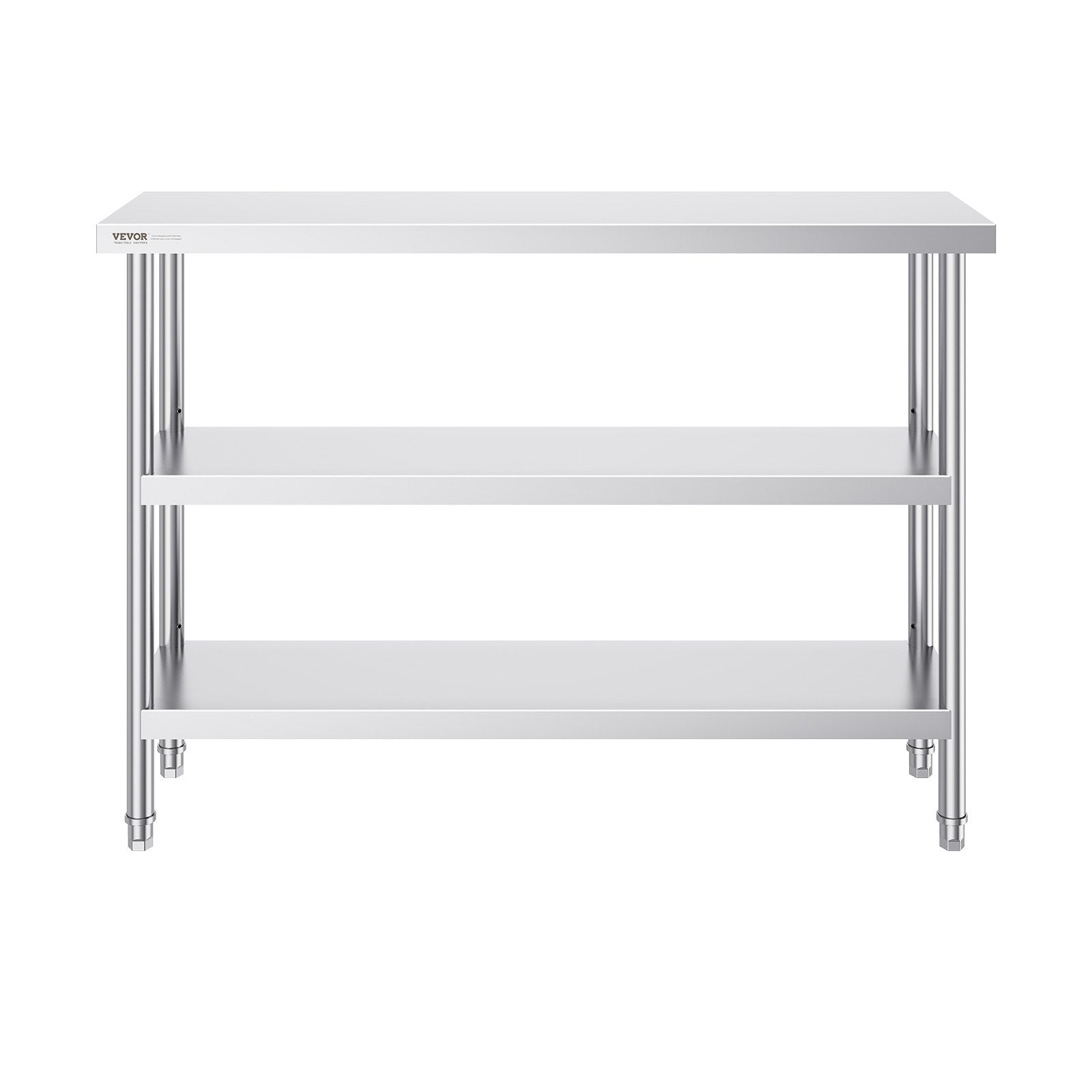 - High-Quality Stainless Steel: This work table, measuring 14 x 48 x 34 inch, is made from SUS201 stainless steel for the tabletop, shelves, and legs. It offers superior rust resistance, a sleek appearance, and a smooth surface that is easy to clean with a simple wipe. NSF certified, it meets strict public health standards, ensuring long-lasting protection for your health.