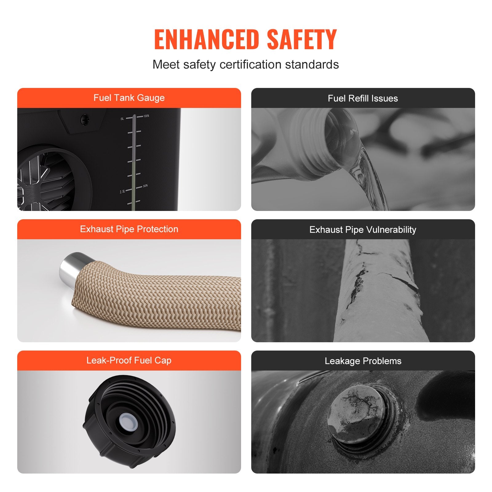 - Innovative CO Alarm System: Our diesel heater features enhanced safety with a built-in CO alarm that continuously monitors CO levels, providing alerts or auto shut-off when needed. Additional upgrades include a leak-proof fuel tank cap, fuel level indicator, and overheat protection—ensuring peace of mind during extended use.