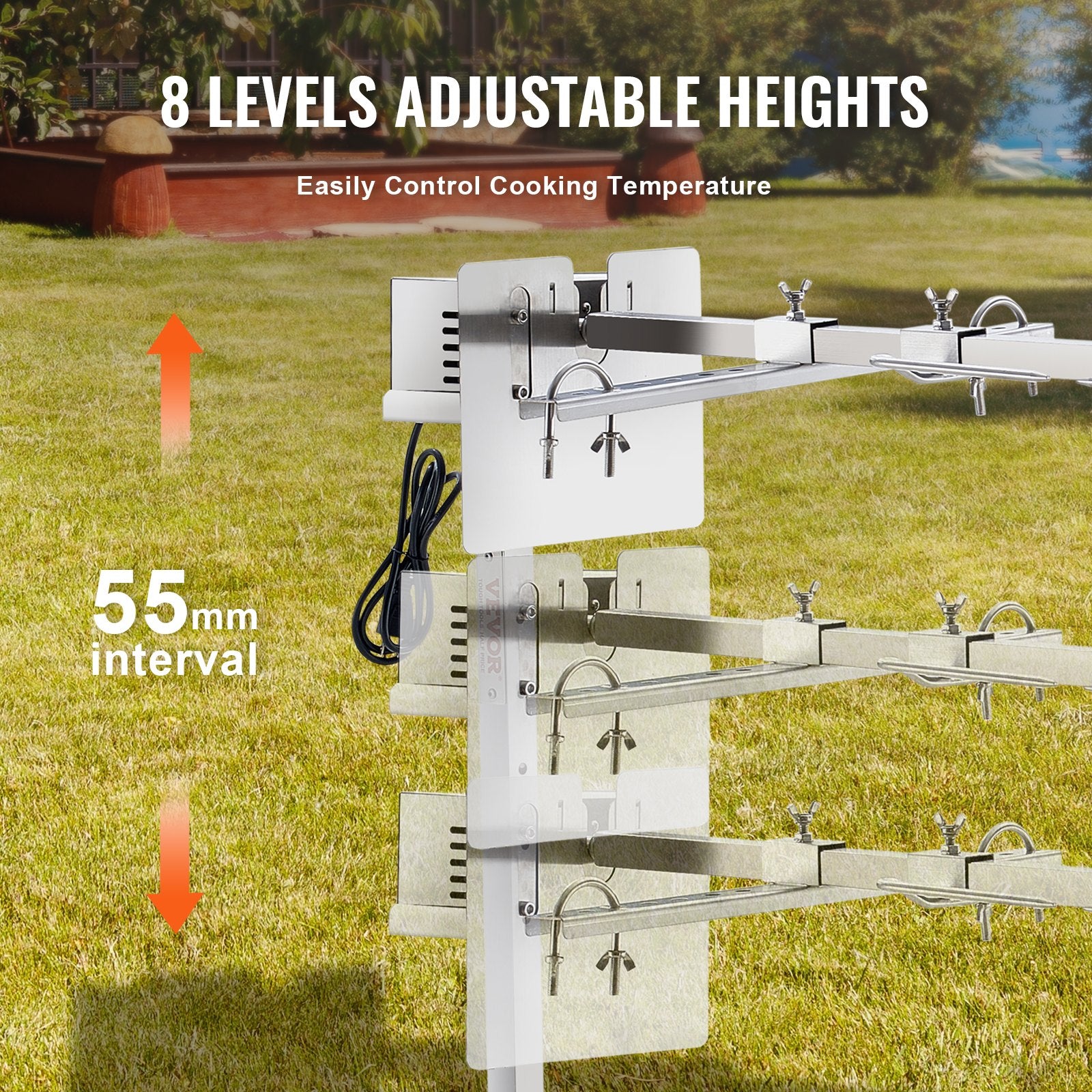 - Adjustable Heights: Designed with 8 different height holes, the grill rotisserie system can be easily adjusted. The bbq rotisserie grill kit is designed to control cooking temperature. The upgraded 45-degree tripod ensures stability even on grass.