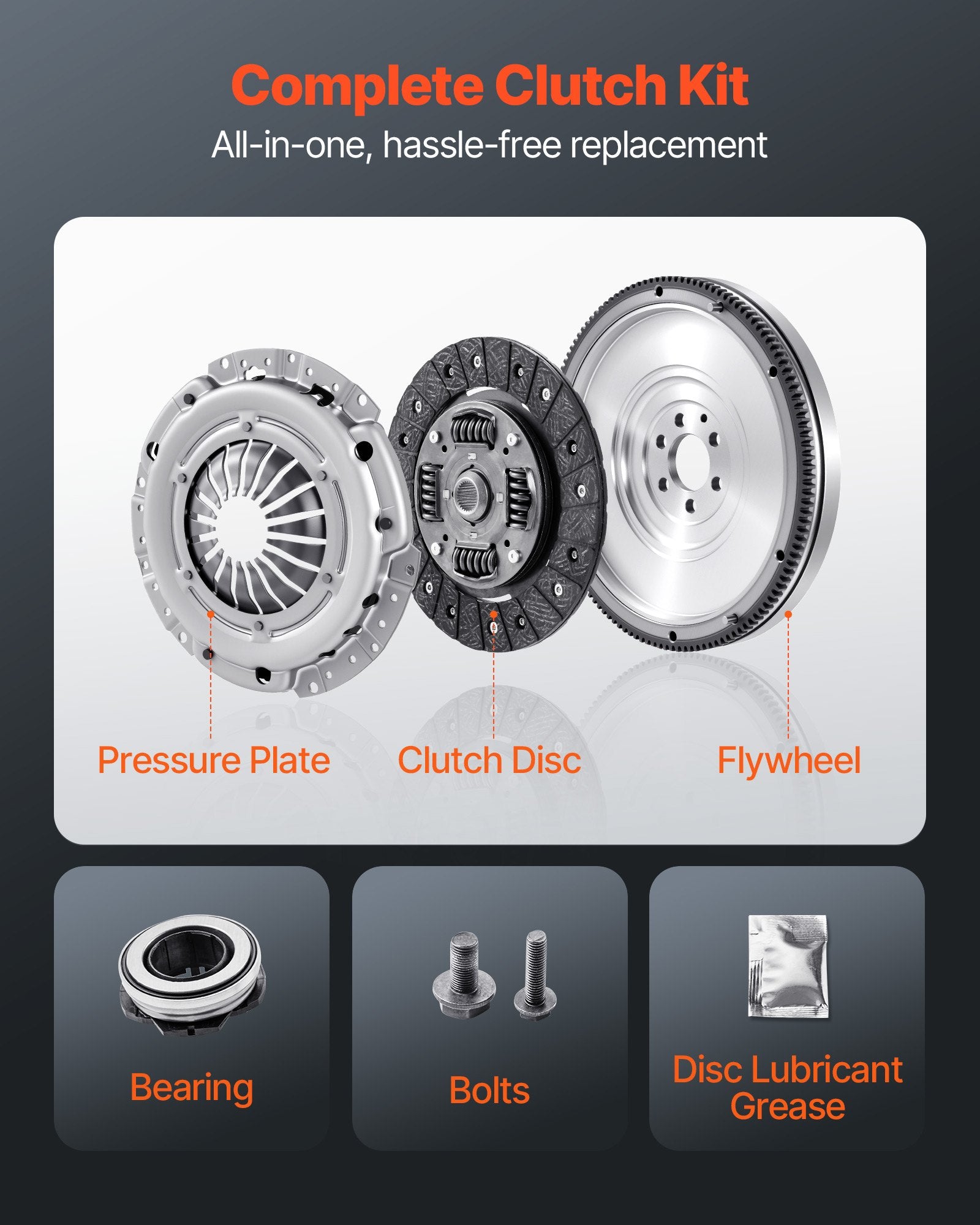 - All-in-One Kit: This kit includes a flywheel, clutch disc, pressure plate, bearing, bolts, and disc lubricant grease—everything you need for a full replacement. Skip the hassle of hunting for extra parts and get your clutch system fixed in one go