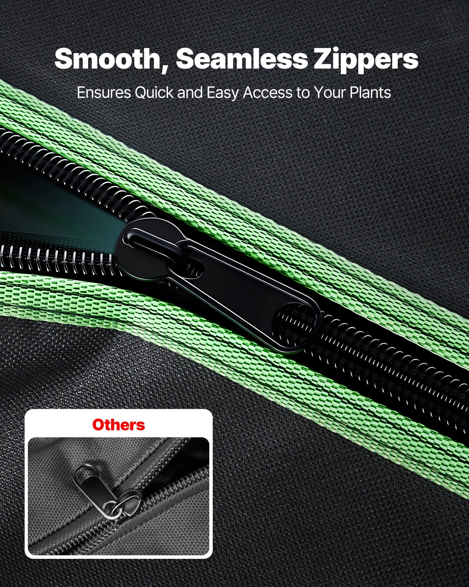 - 100% Reflective Interior: The interior features polyester film that maximizes light reflection and minimizes heat loss, promoting healthier plant growth. The exterior is made from durable 600D Oxford fabric that is tear-resistant and light-blocking. Zippers with double black lining effectively seal gaps