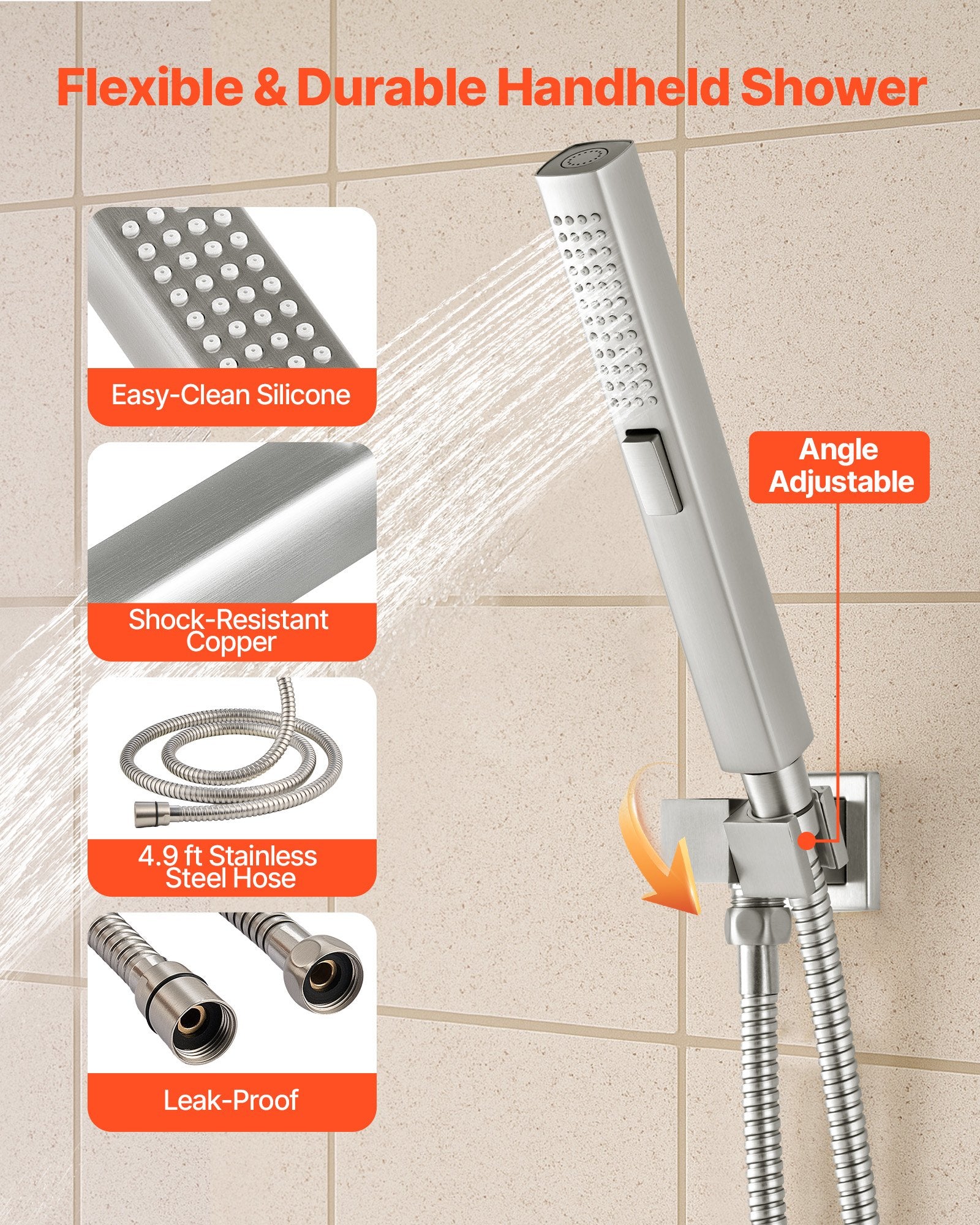 - 2-in-1 Handheld Shower: Part of our shower system, it provides shower and spray gun modes. The pressurized jet rinses walls and tubs, then auto-returns to shower mode to avoid accidents. A 4.9 ft/1.5 m hose and swivel holder ensure multi-angle cleaning