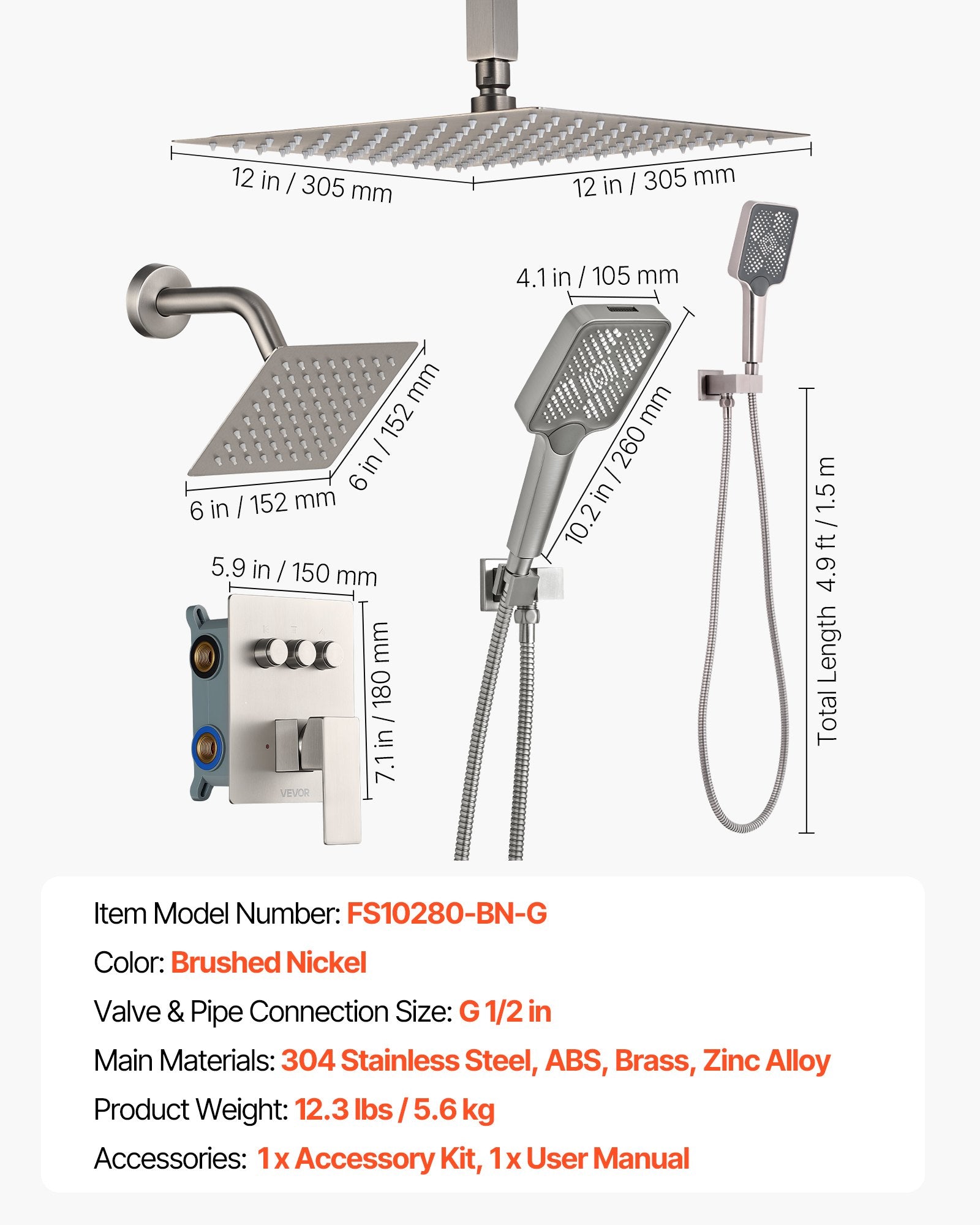 Shower Faucet Set, 305 mm Ceiling Mount Rainfall Shower System with 152 mm Wall Mount Head and 4 in 1 Handheld Spray, Rotatable 3-Function Dual Rain Head Brass Valve & Trim Kit, Brushed Nickel
