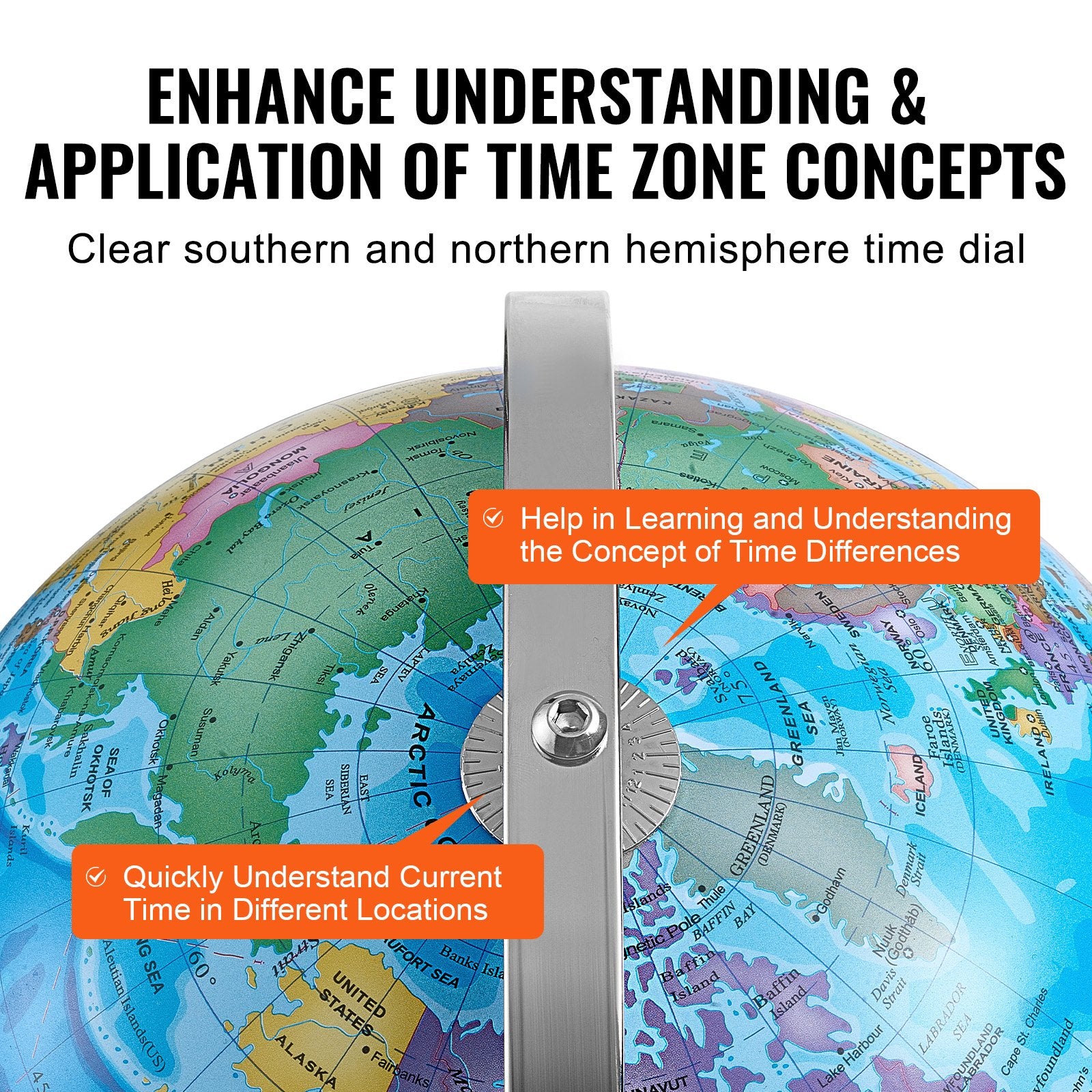 - Master Time Zones with Precision: Our educational globe is equipped with a precise time dial, helping students better understand and apply the concept of time zones. By rotating the dial to the corresponding position, students can quickly learn the current time in different regions, aiding in the comprehension of time differences and enhancing their geographic knowledge. Make learning time zones fun and intuitive