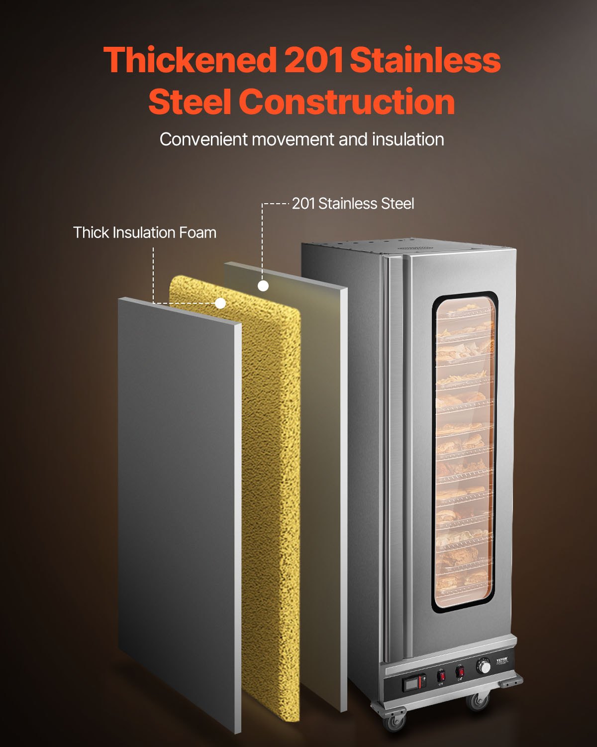 - Keep Warm for a Long Time: The commercial hot box food warmer cabinet features an adjustable temperature range of 80℉-177℉ with rapid heating and long-lasting warmth. Real-time temperature tracking and simple operation make it perfect for storing delicious, juicy cooked meats, pasta, crispy fried foods, fermented yogurt, and dried fruits and vegetables.