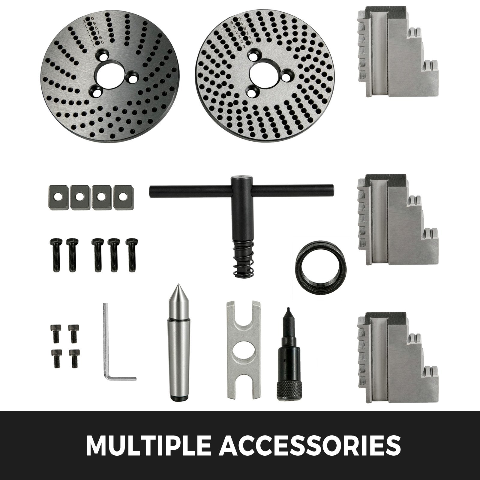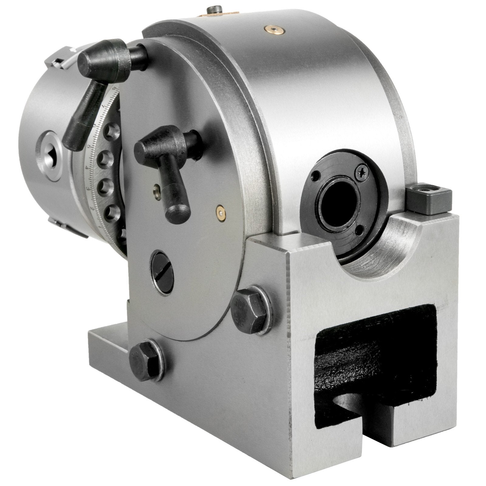 - 【ADJUSTABLE DIVIDING HEAD】- The semi-universal dividing head features 4" 3-jaw chuck, Spindle Hole Diameter: 18mm. The headstock is adjustable from the horizontal position to 90 degrees upward. Center Height: 4"/100mm. Free 3 more jaws for 4" chuck.