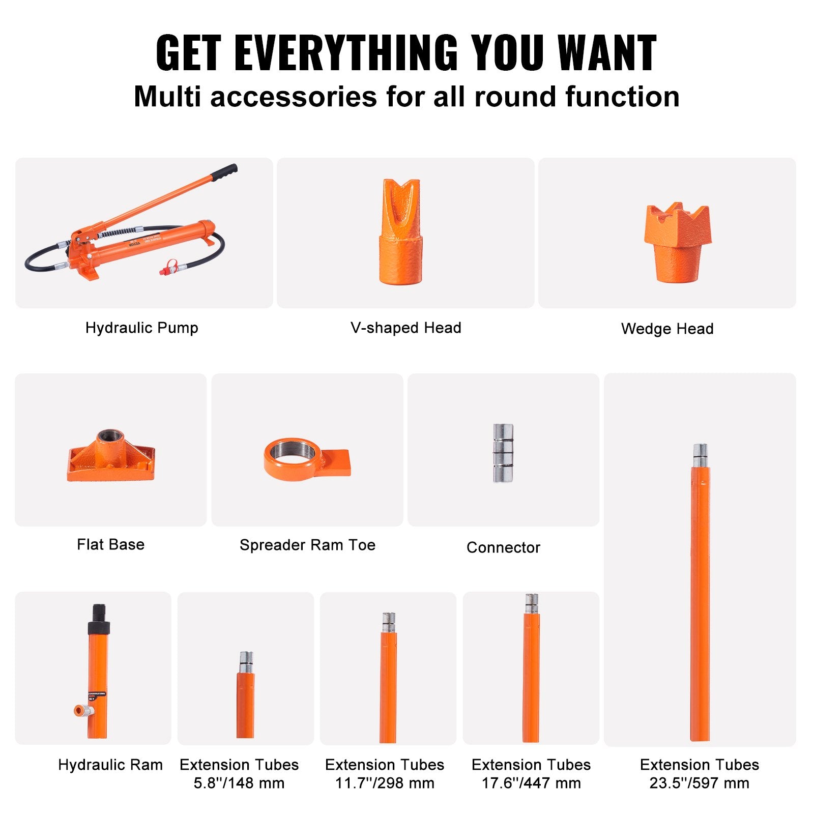 - Perfect for All Your Needs: The portable hydraulic ram kit includes everything you need to complete your repair work! Hydraulic pump, hydraulic ram, 3pcs extension tubes, V-shaped head, wedge head, connector, flat base, spreader ram toe. You will be ready to take on any project without breaking a sweat.