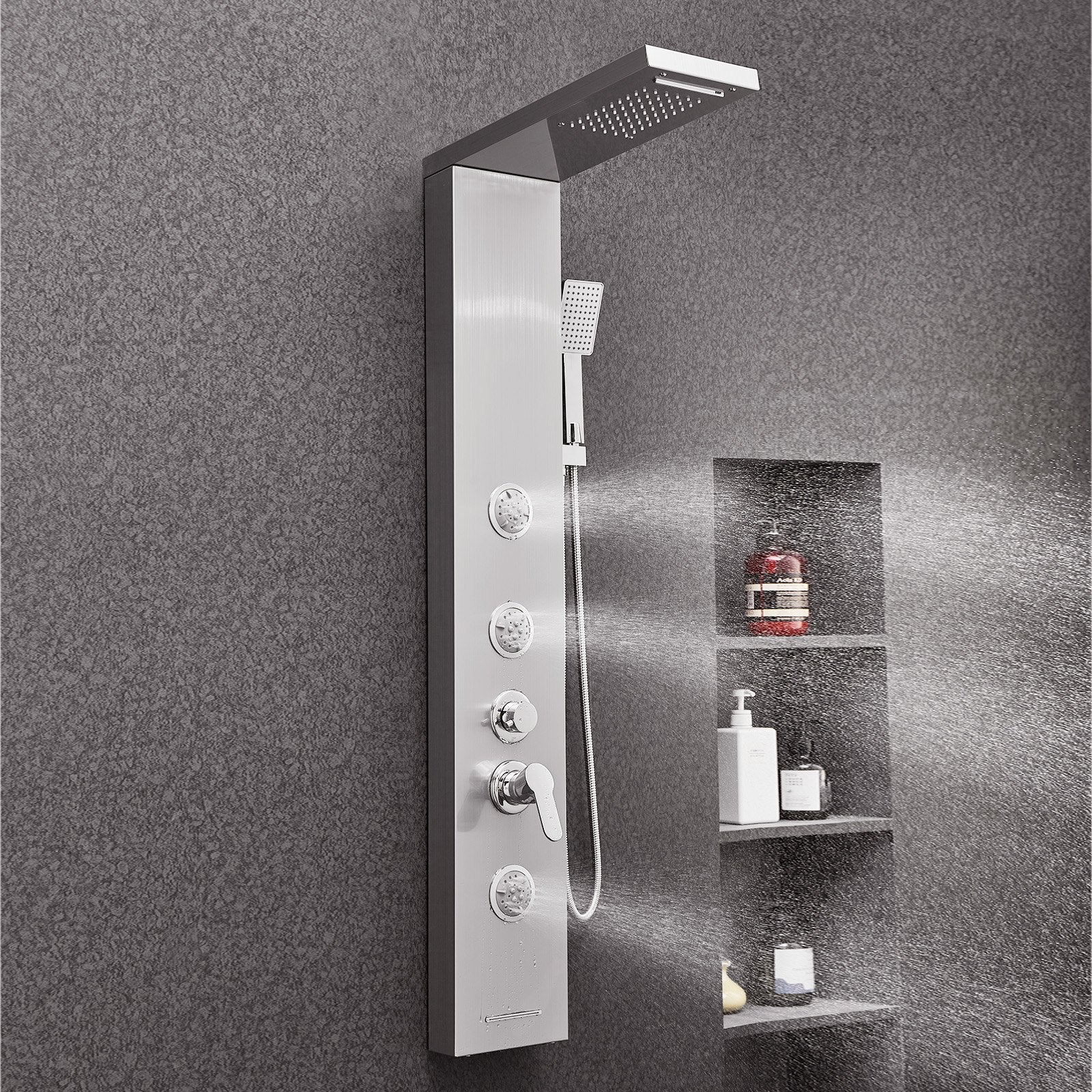 Shower Panel Tower System with Rainfall Waterfall Shower Head, 53 in Brushed Stainless Steel Shower Column, 5-Function Faucet, Wall-Mount Rain Massage System with 3 Body Jet, Handheld, Tub Spout