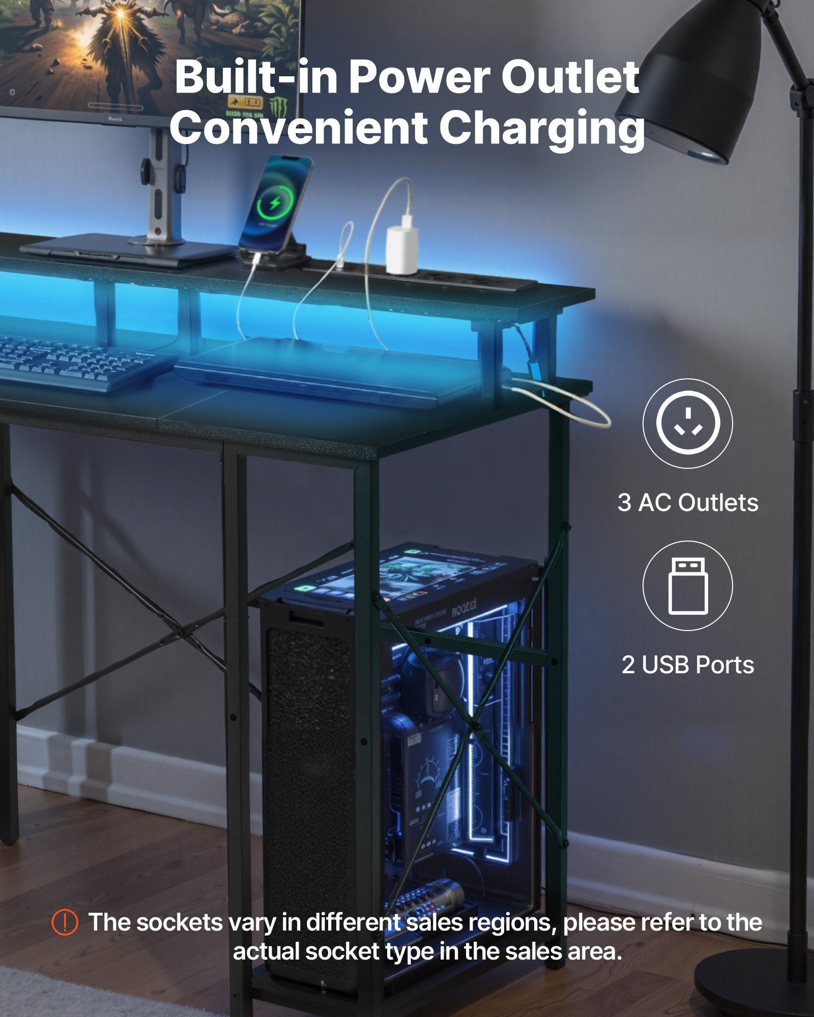 - Upgrade Your Workspace: This computer desk has a built in power strip with 4 three prong outlets, 2 USB ports, and 6.5 ft / 2 m power cord for devices, plus a reversible storage shelf you can mount left or right to match your setup