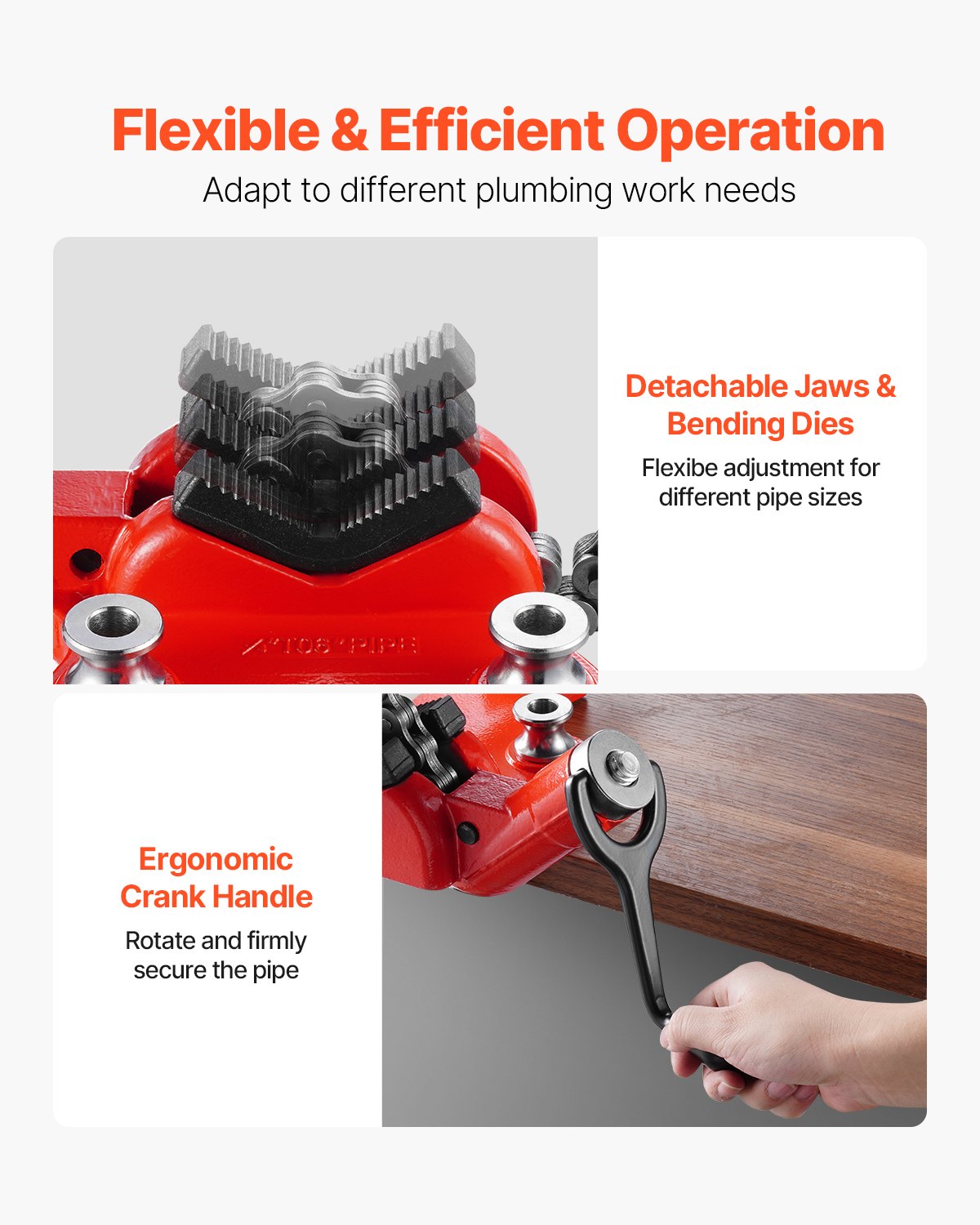- Flexible Operation: Featuring detachable jaws and bending dies, this pipe vise meets different plumbing work needs. The ergonomic crank handle enables precise control of chain tightening, greatly enhancing work efficiency.