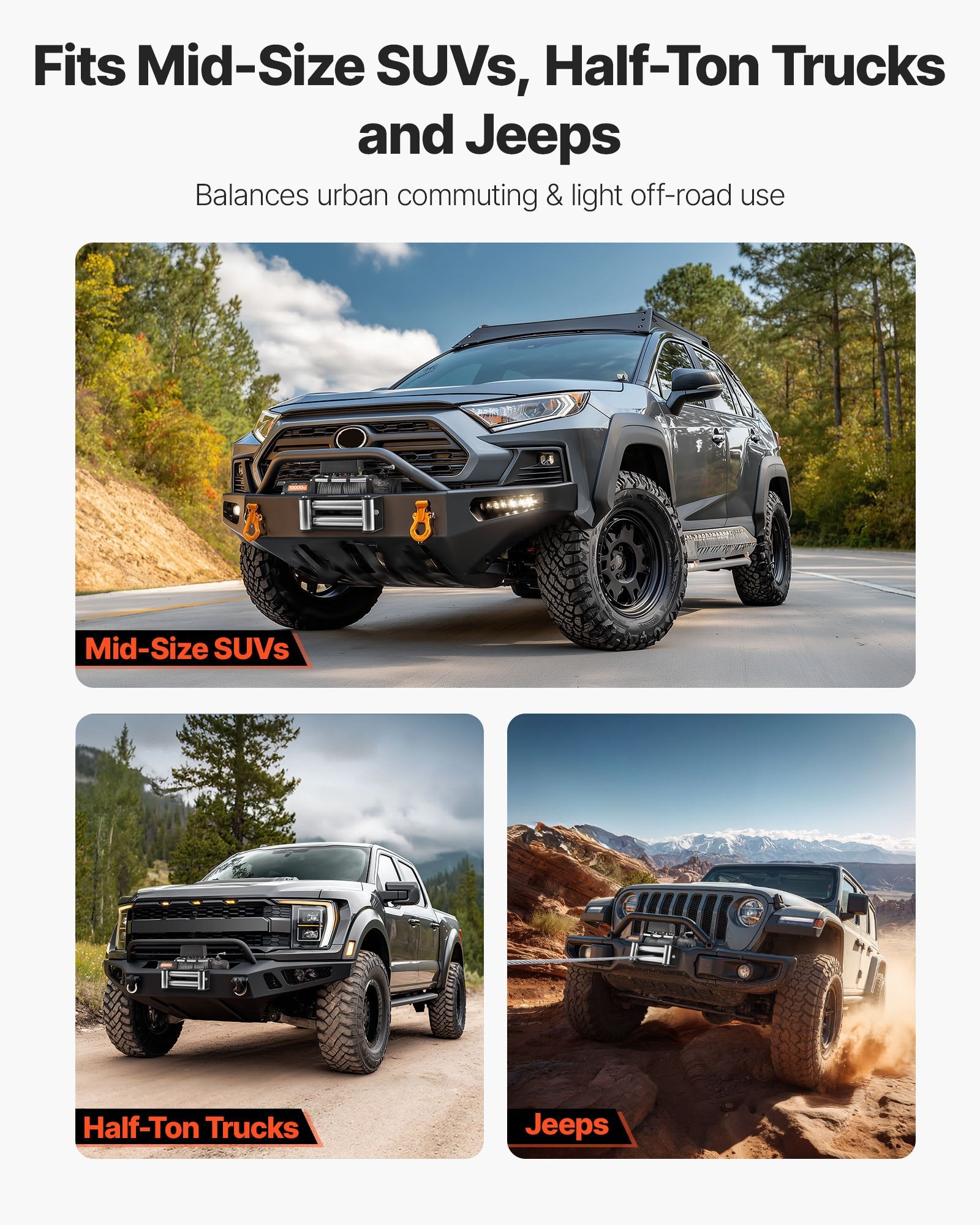 - Wide Compatibility: The universal mounting pattern fits most SUVs, pickups, and Jeeps. The recovery winch set includes fairlead, hook, and power cables—ready for fast setup and use.