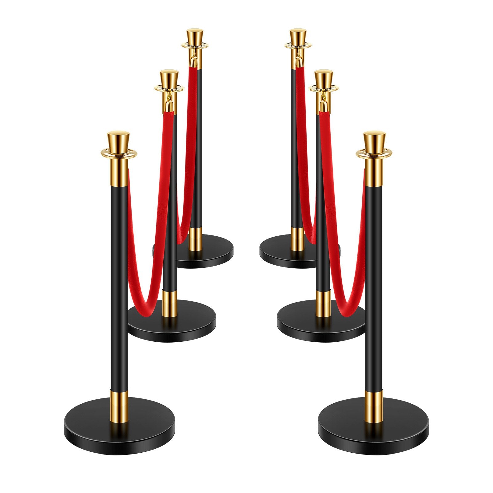 Stanchion Post, 6 Pcs Crowd Control Barrier with 4 Red Velvet Ropes, 5 ft Stainless Steel Black Stanchion Post Queue with Sand Injection Hollow Base for Theater, Party, Wedding, Exhibition