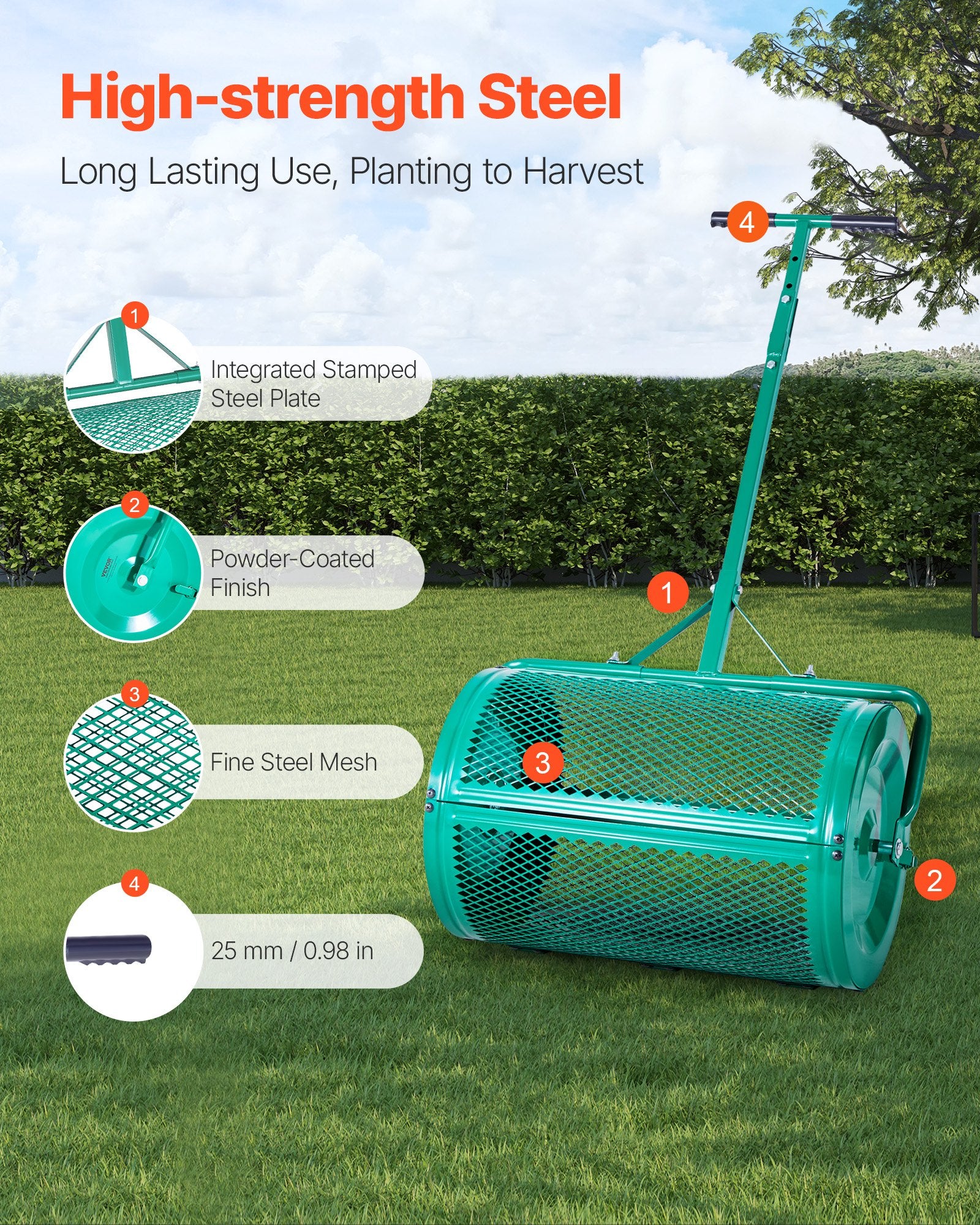 - Large Capacity Roller: This 24-inch peat moss roller holds up to 2.66 cu.ft of material, reducing the need for frequent refills. Fill it once with grass seed, fertilizer, or soil amendments to complete large jobs faster and with less effort