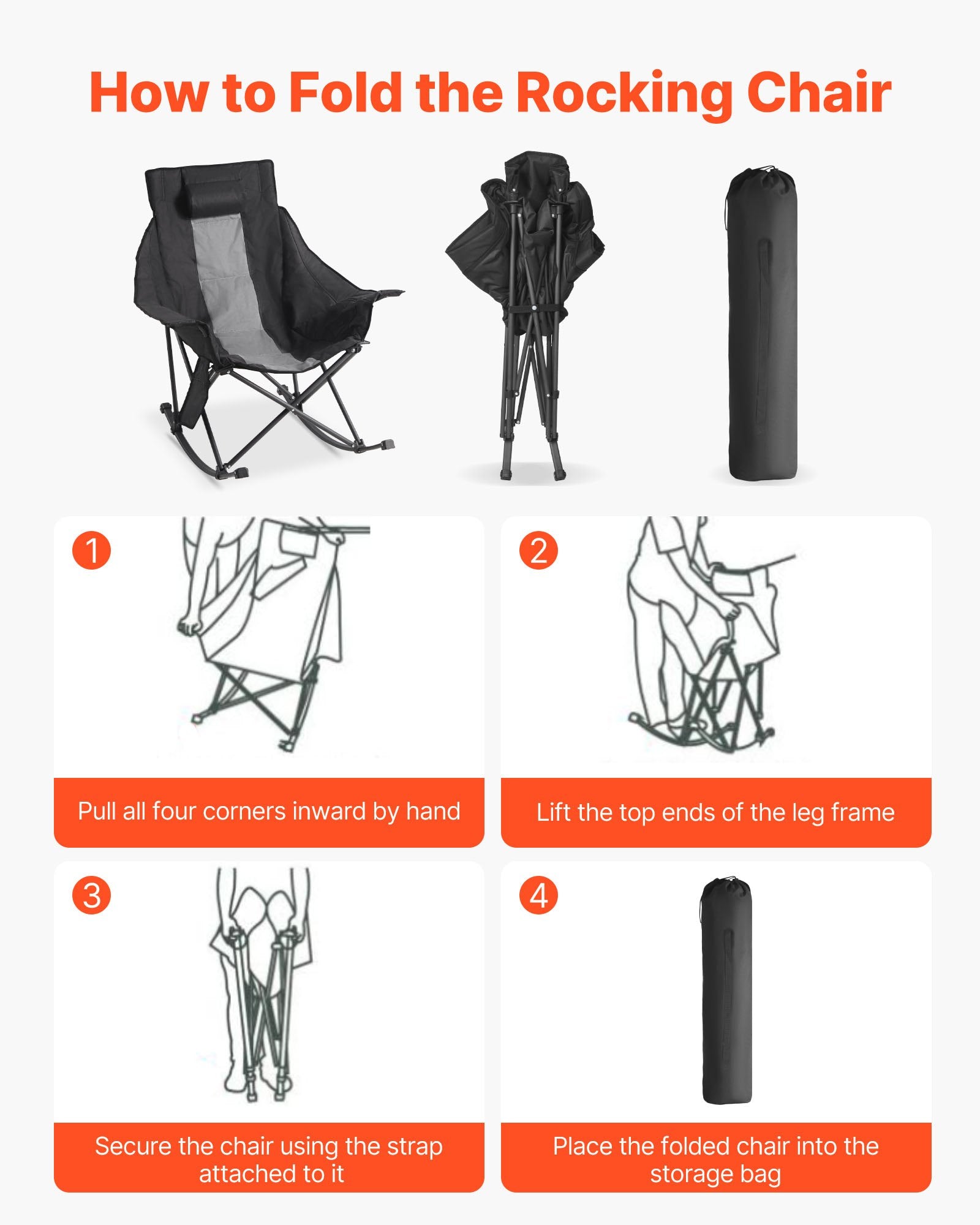 - Quick Fold: Folds the camp rocker chair in seconds—just pull the four corners inward, lift the legs, and secure it with the attached strap before placing it in the storage bag. No tools needed—easy to pack and go.