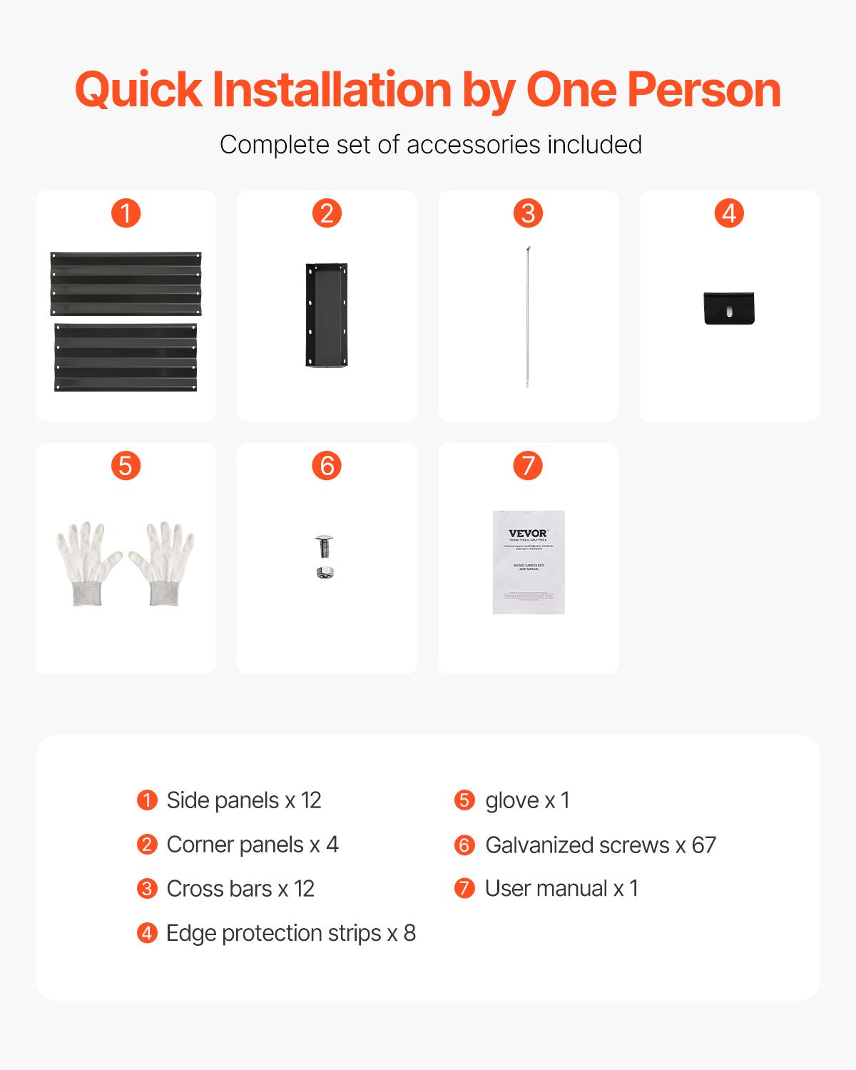 - What You'll Get: Our raised garden bed includes 12 side panels, 4 corner panels, 12 cross bars, 8 edge protection strips, 1 pair of gloves, 67 galvanized screws, and a user manual.