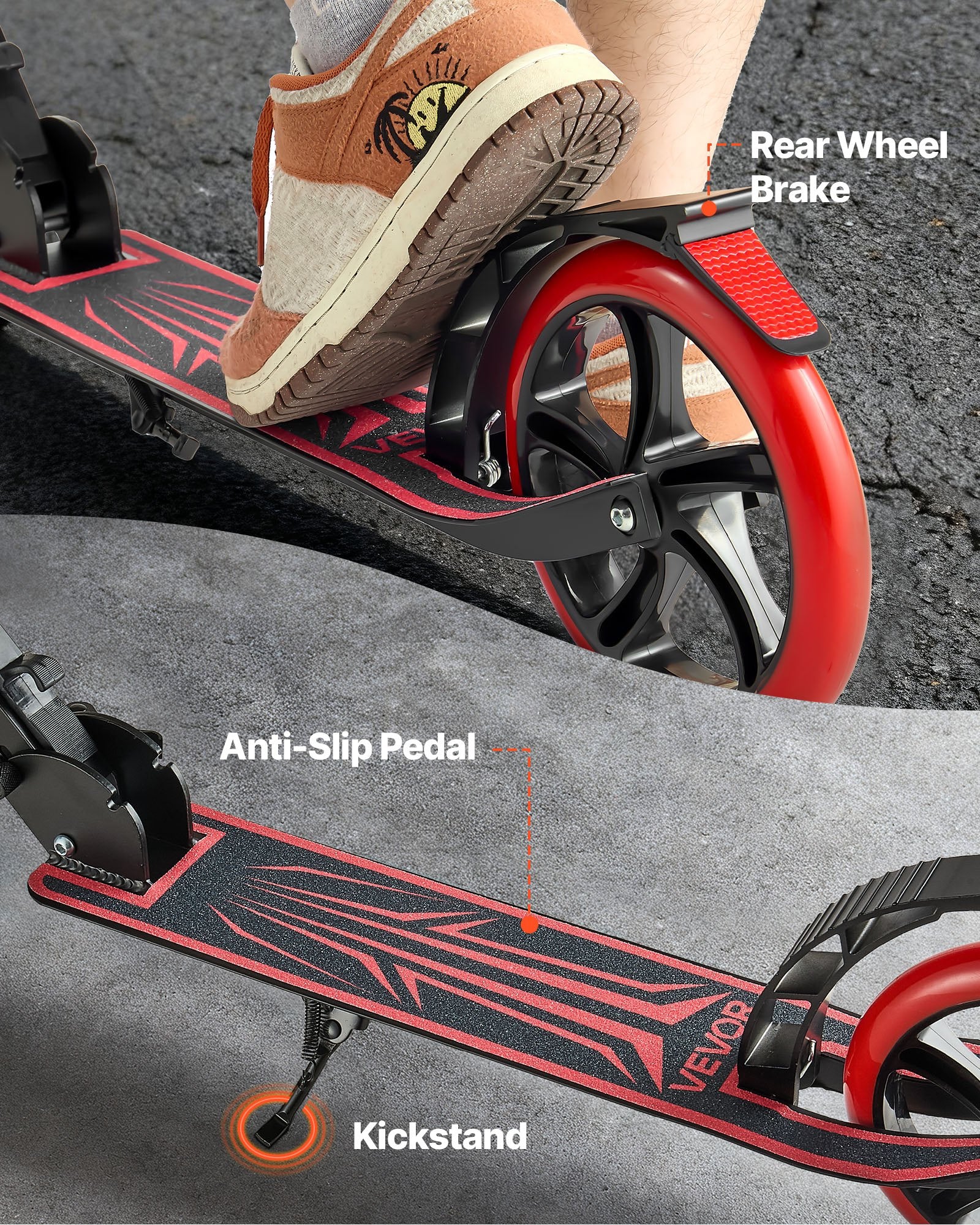 Kick Scooter for Kids Ages 8+, Teens & Adults, 2-Wheel Toddler Scooter with Adjustable Height Handlebar, Wide Anti-Slip Deck, Foldable Lightweight for Boys & Girls up to 99.8 kg, Black + Red