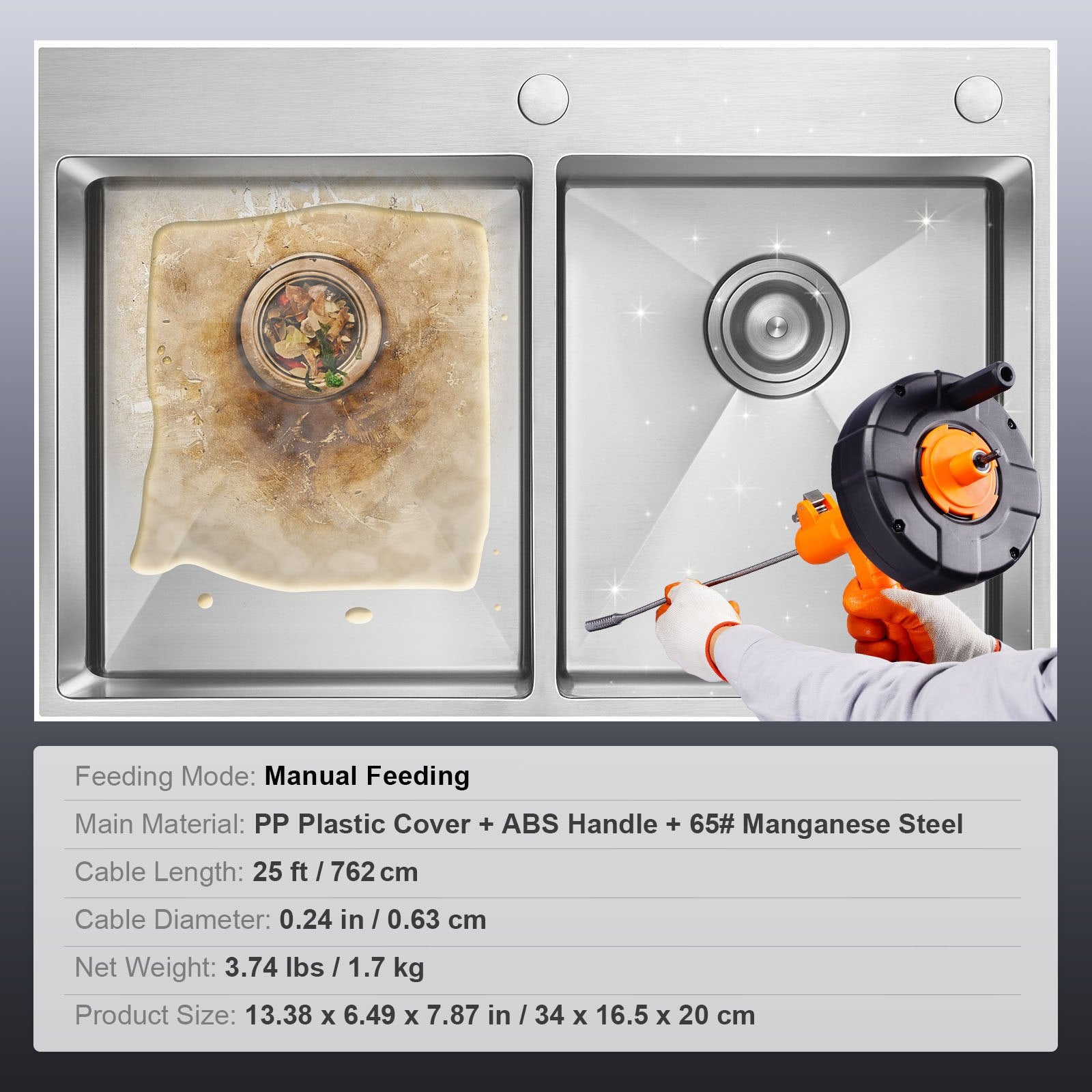 - Multifunctional Drain Cleaner: VEVOR handheld plumbing snake drain auger offers good versatility and cost effectiveness, quickly clearing debris from the most stubborn drains such as tea, peel, food residue, paper, bone, hair, and clothing unclogged in toilets, sewers, floor drains, sinks, pipelines, bathtubs.