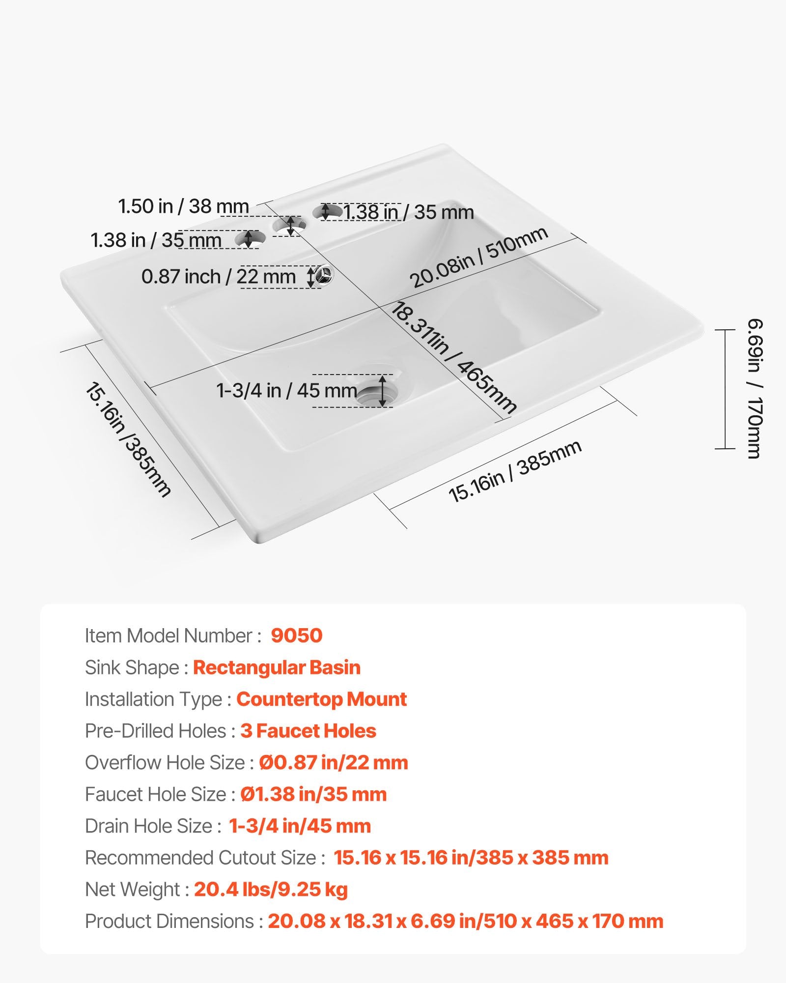 - Countertop Installation: Our 20.08 x 18.31 x 6.69 in semi recessed bathroom sink features a 1-3/4 in drain & three pre-drilled faucet holes, recommended cabinet cutout 15.16 x 15.16 in. Fits home, hotel, apartment bathrooms (Faucet & drain not included)