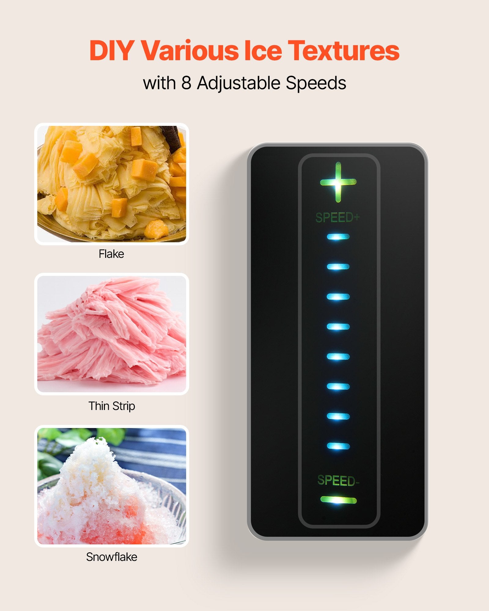 - 8 Adjustable Speeds: With 8 adjustable speeds, this snowflake ice maker lets you create different textures such as fluffy snowflake ice, thin strips, noodle-like ice, or flakes, giving you smooth and refreshing desserts every time