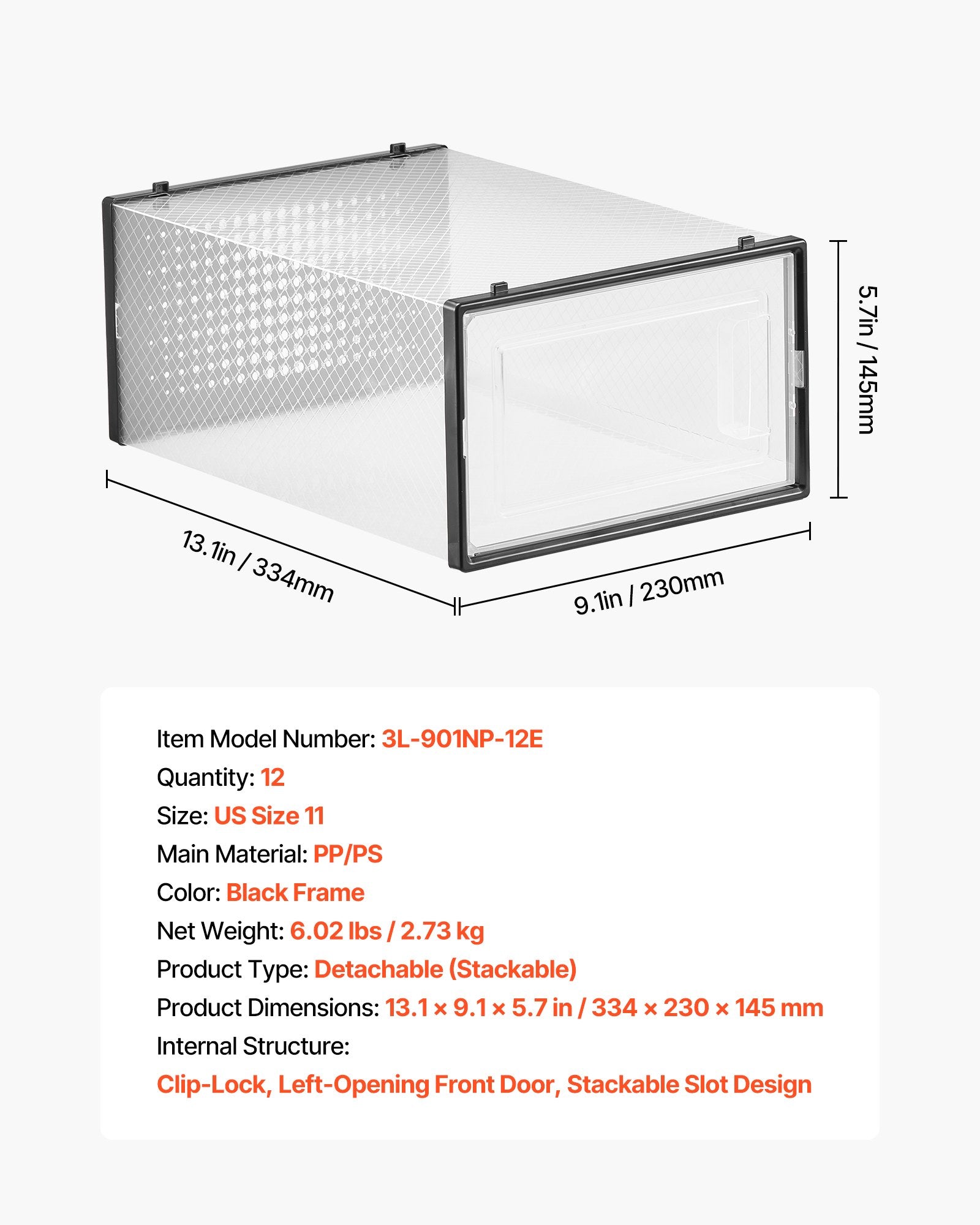 - Spacious and Versatile: Generous size (13.1 x 9.1 x 5.7 in) fits a wide range of shoe types and sizes. Our stackable shoe boxes are also ideal for hats, clothing, small items, toys, and more. The clear design allows you to quickly find what you need