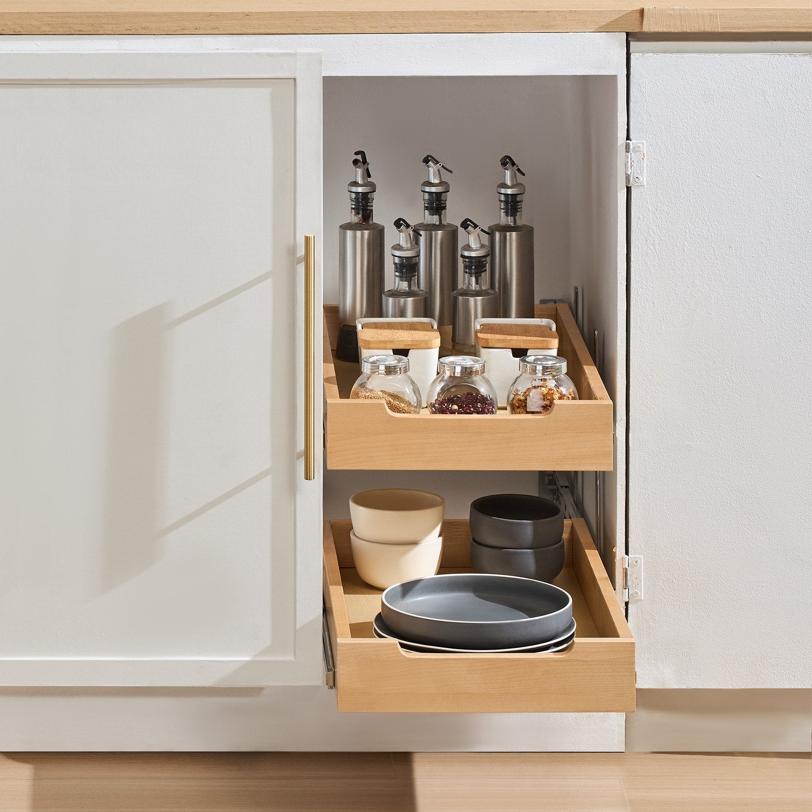 2 Tier Pull Out Cabinet Organizer, 14"W x 21"D Cabinet Drawer, Soft Close Slide out Shelf, Heavy-Duty Sliding Wood Drawer, Adjustable Base Cabinet Organization for Kitchen Pantry Bathroom