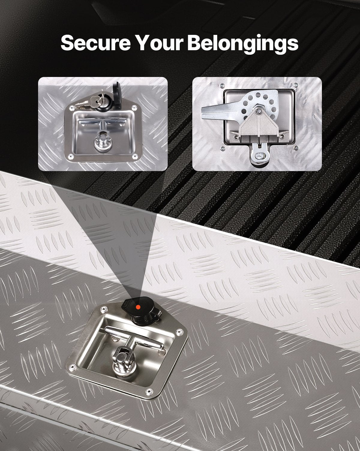 - Upgraded Anti-Theft: The T-handle lock offers stronger resistance to vandalism and comes with two keys, preventing forced entry. This aluminum truck box protects your tools when parked at construction sites or in parking lots