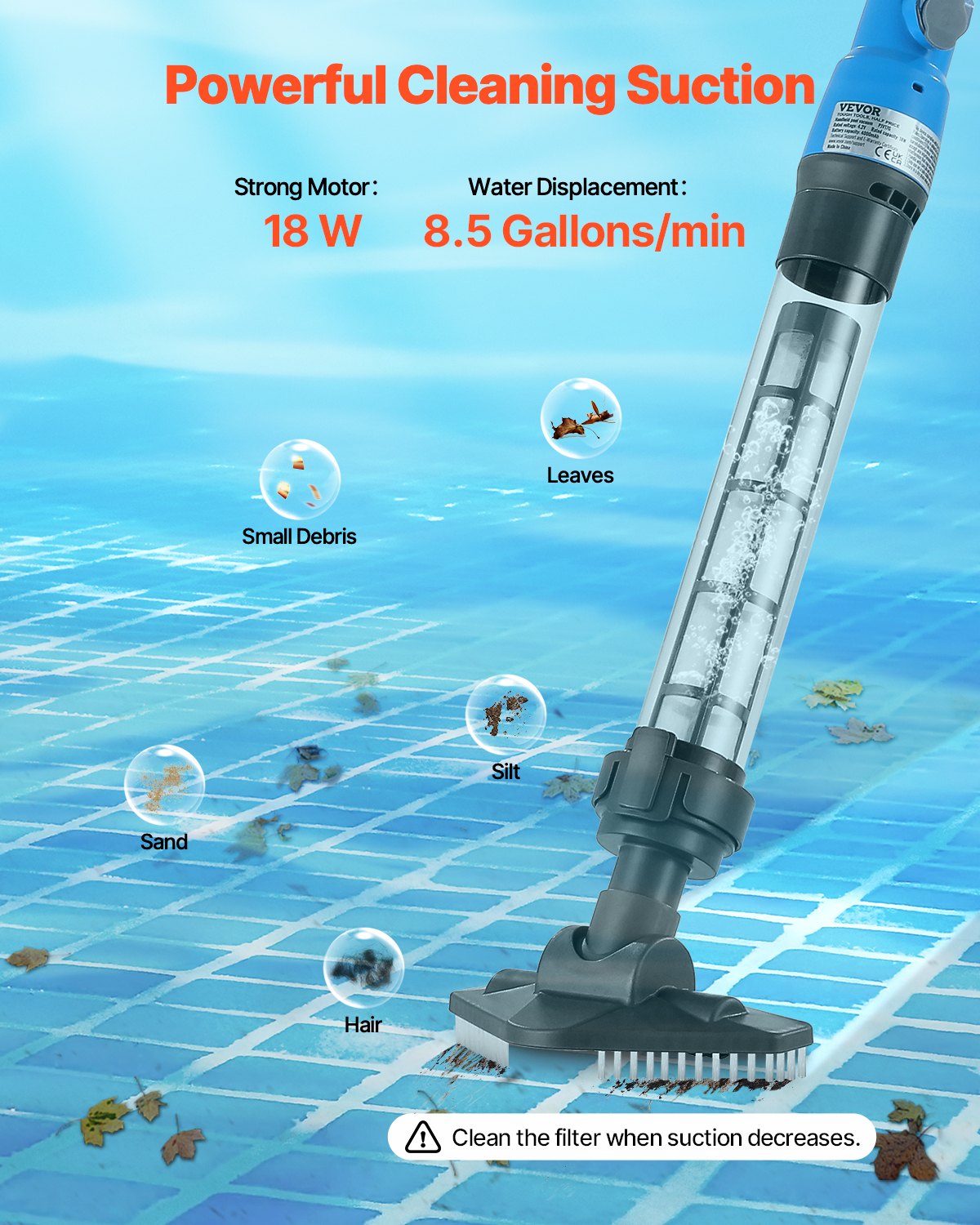 - Powerful Cleaning Performance: This pool vacuum cleaner is equipped with a high-performance motor, delivering a drainage flow rate of 8.5 gallons/min (32L/min) to quickly clean off dirt, sand, leaves, and seeds from the pool bottom (excluding algae). Enjoy a cleaner, more hygienic swimming environment.