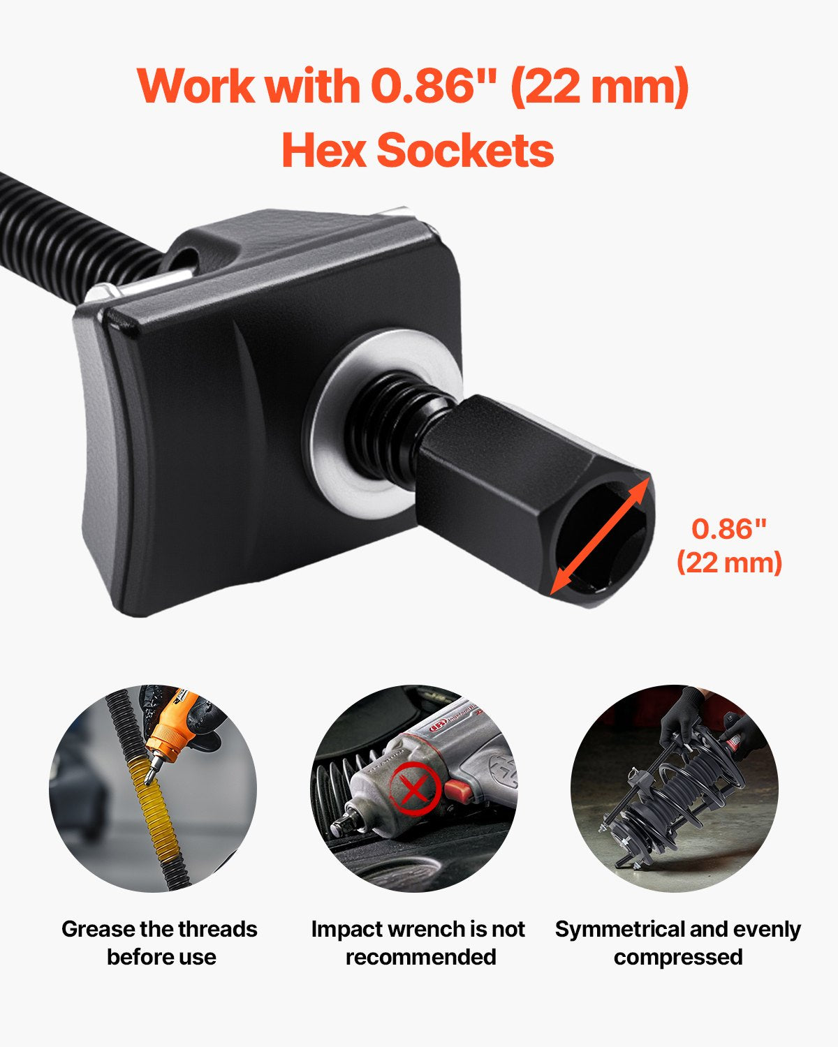 - Secure Compression: The hexagonal end fits 0.86 in / 22 mm sockets or manual wrenches. Avoid using impact wrenches when compressing the spring for security!