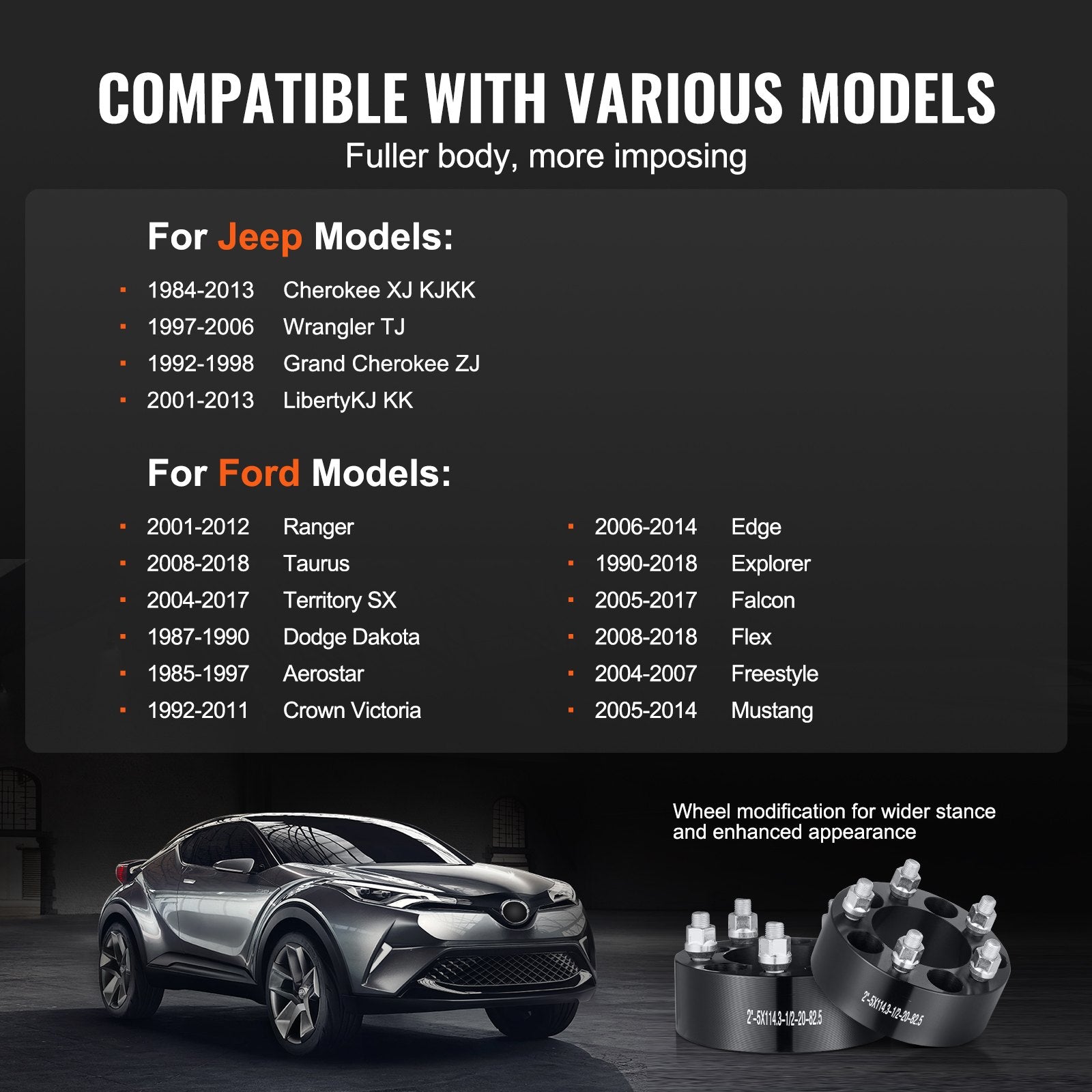 - Wide Compatibility: These wheel spacers are compatible with many Jeep and Ford vehicles from 1984 to 2018, including: Jeep: 1984-2013 Cherokee XJ KJ KK, 1997-2006 Wrangler TJ, 1992-1998 Grand Cherokee ZJ, 2001-2013 Liberty KJ KK. Ford: 2001-2012 Ranger, 2008-2018 Taurus, 2004-2017 Territory SX, 1987-1990 Dodge Dakota, 1985-1997 Aerostar, 1992-2011 Crown Victoria, 2006-2014 Edge, 1990-2018 Explorer, 2005-2017 Falcon, 2008-2018 Flex, 2004-2007 Freestyle, 2005-2014 Mustang.