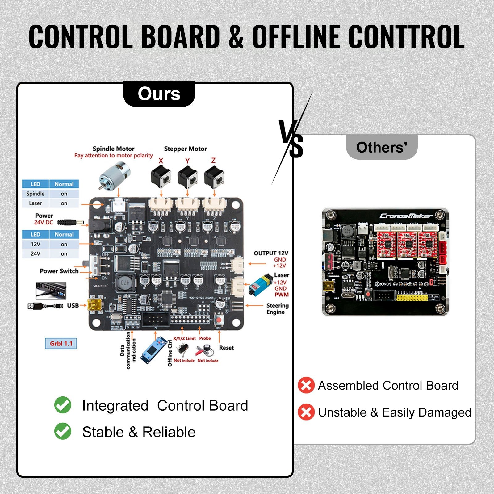 - Upgraded Control Board: The integrated GRBL control features full functionality and stability. And the advantages of the offline controller lies in the following ones: 1. No need to connect to the computer; 2. Arbitrary selection of offline files for engraving. 3. Manually adjust the X, Y, and Z axes position as the engraving starting point, manually turn on or off the spindle.4. High precision: less than 0.003 inches.