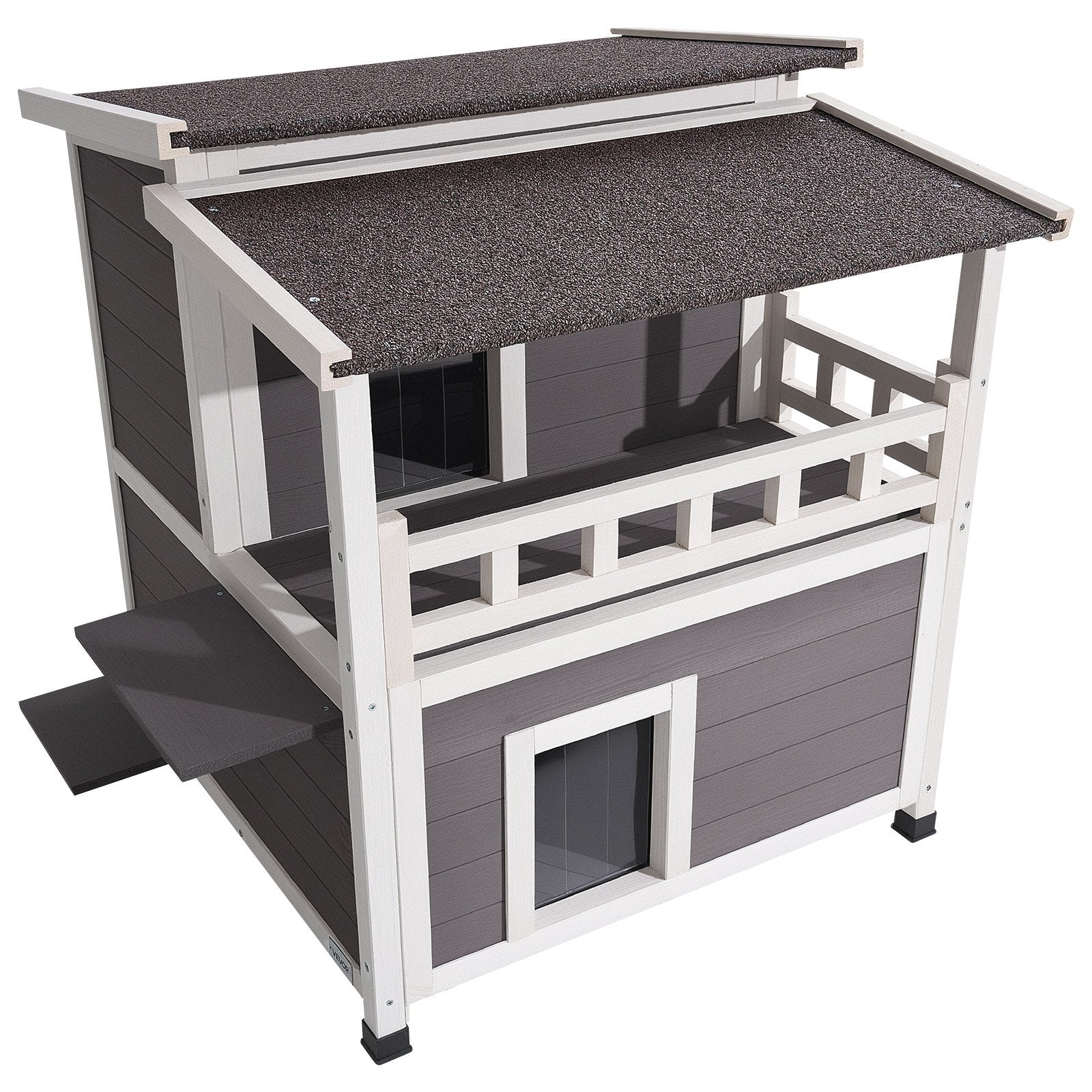 - Comfortable Living Space: Our wooden cat house with a spacious platform allows cats to bask in the sun, climb, and jump that helps reduce stress and satisfy cat's natural instincts. The PVC door curtain allows both ventilation and light and two-story lounge area offers more choices for resting