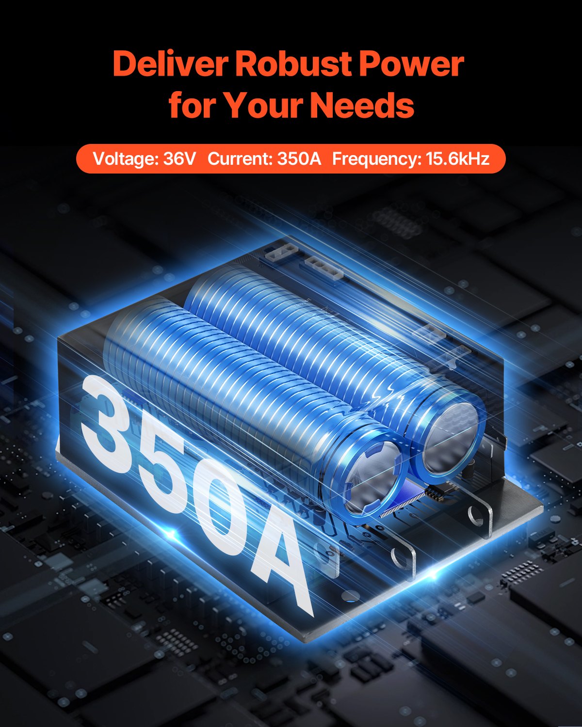 - Stable Performance: With 36V and 350A output, this golf cart motor controller delivers smooth, steady power to the motor. The 15.6kHz high-frequency regulation and quick start function enhance efficiency and responsive acceleration. It supports stepless speed adjustment and reverse braking for precise and seamless driving