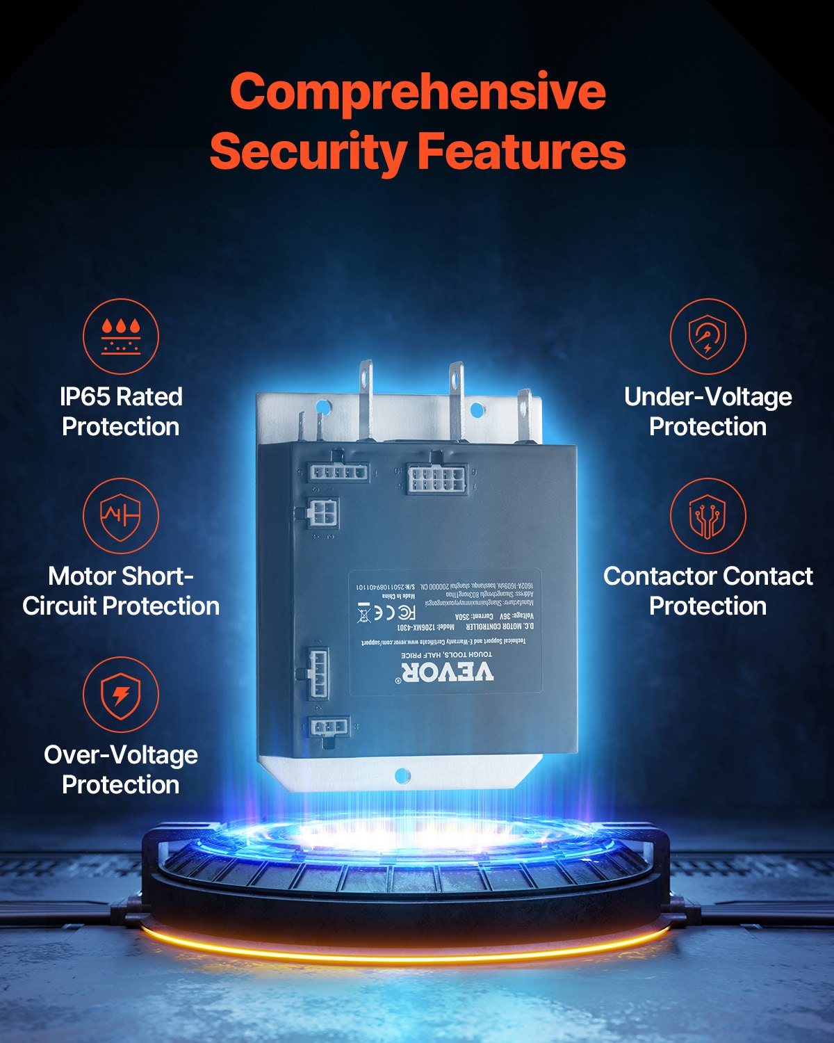 - All-Around Protection: This golf cart controller features built-in motor short-circuit, over-voltage, under-voltage, contactor contact, and temperature protections. IP65 waterproof is suitable for harsh weather and challenging environments, ensuring secure and reliable operation