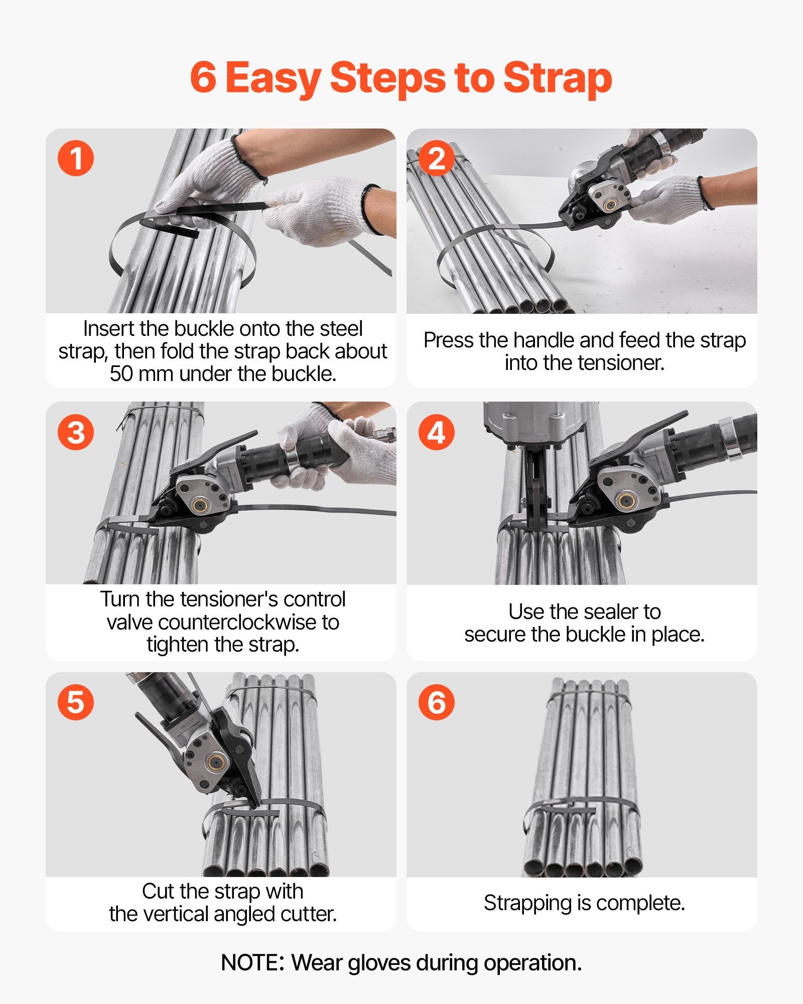- Simple to Operate: Users just thread the strap, tighten with the tensioner, and lock with the sealer. Even beginners can use our pneumatic steel strapping tool easily. The alloy body and steel gears ensure durability and reliability