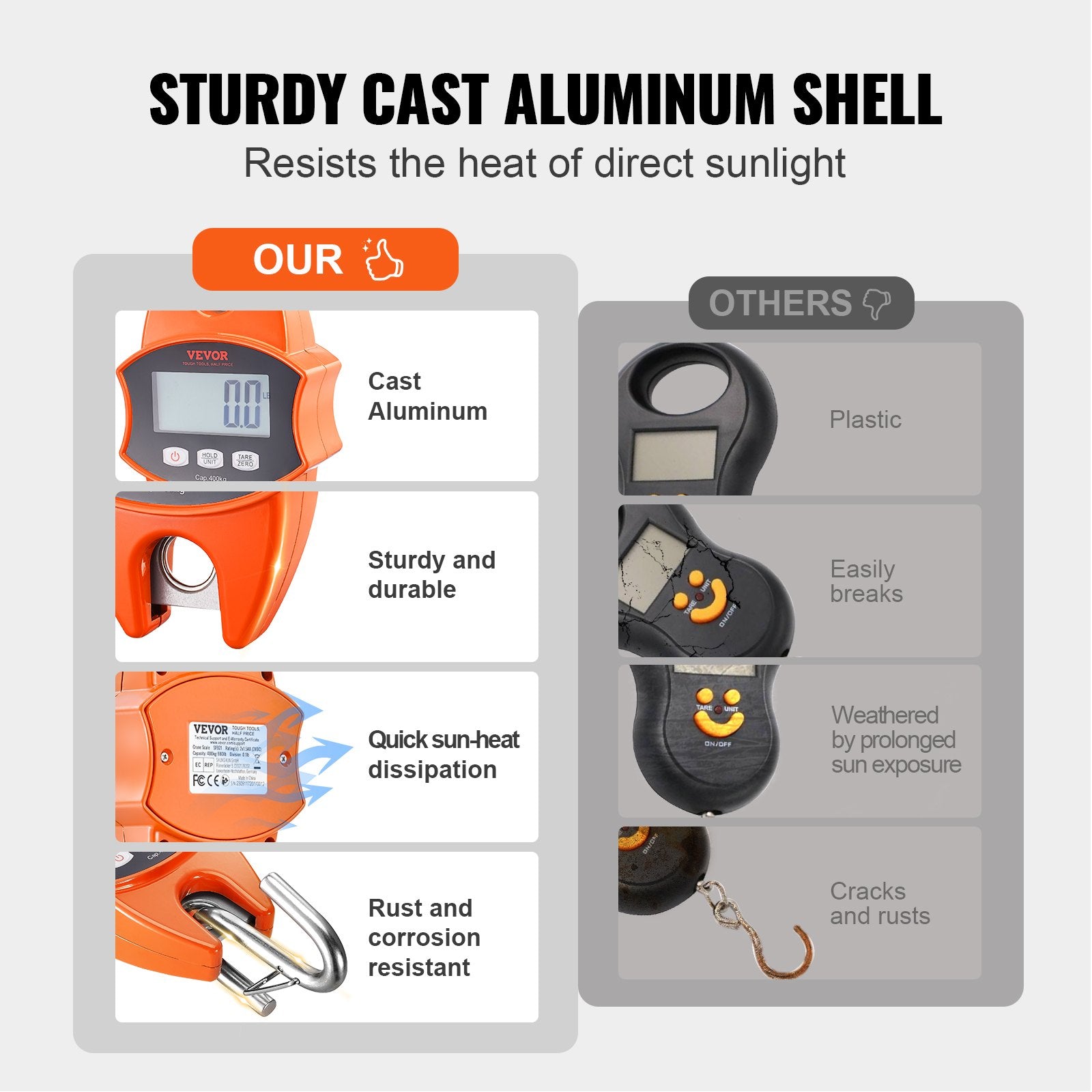 - Sturdy Cast Aluminum Material: Forget those fragile plastic scales! Our hanging scale sports a shiny cast aluminum body. It's like the superhero of crane scales: basks in the sun, laughs at rust, and isn't bothered by a bit of heat or cold (yeah, from -10℃ to 40℃). Plus, its sleek design feels oh-so-right in your hand.