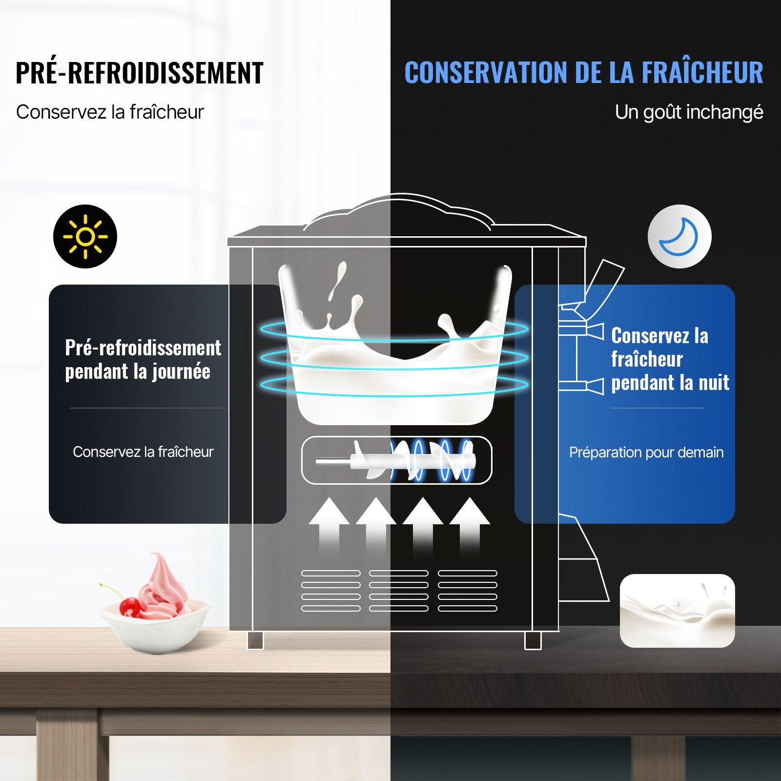 - Smart LCD Control Panel: Our soft-serve ice cream maker is equipped with a smart digital panel, so you can be in constant control. The quantity of ice cream is displayed on the LCD screen for direct observation. Practical functions are also combined here. You can set the ice cream firmer or softer according to your taste. With the fresh-keeping function, you can put the ingredients in the hopper overnight and enjoy a tastier ice cream. Even more surprisingly, self-cleaning can be activated with just one click.