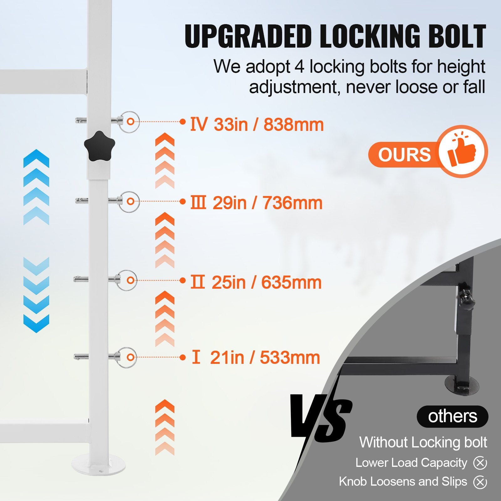 - 4-Level Height Adjustment: The unique pin design offers four adjustable height options, ranging from 21" to 33", catering to animals of different sizes. Reinforced uprights with a triangular frame enhance loading capacity, ensuring safety and stability.